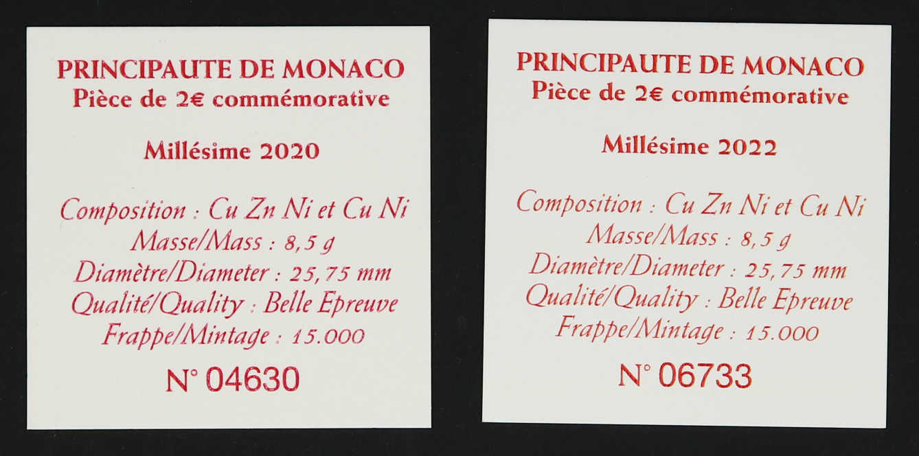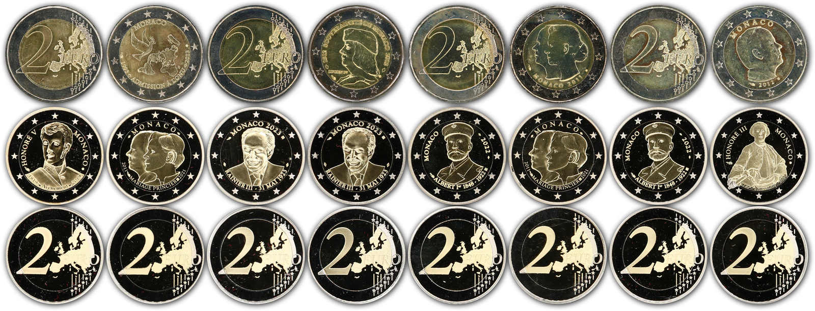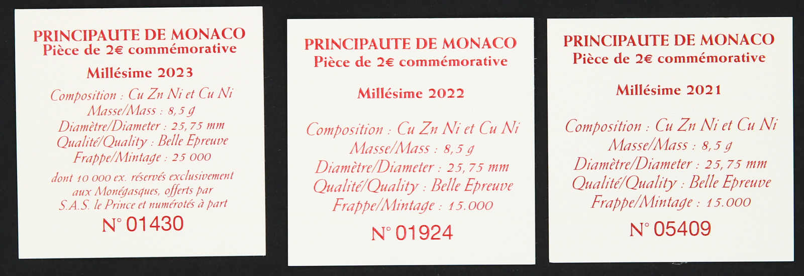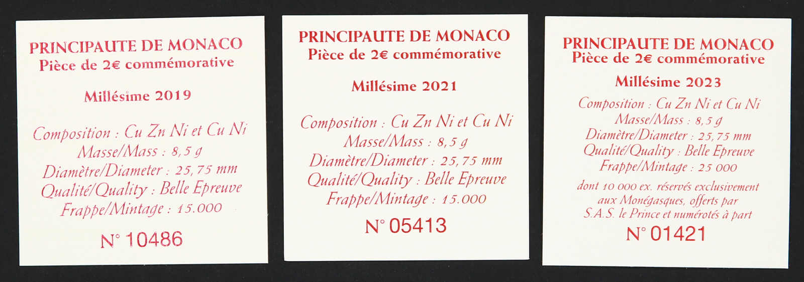 MONACO: 2019/23, original in Box und Schleife 2 Euro 2019, 2020, 2 Stück 2021, 2 Stück 2022, 2 Stück 2023, dazu lose 4 Euro Monaco