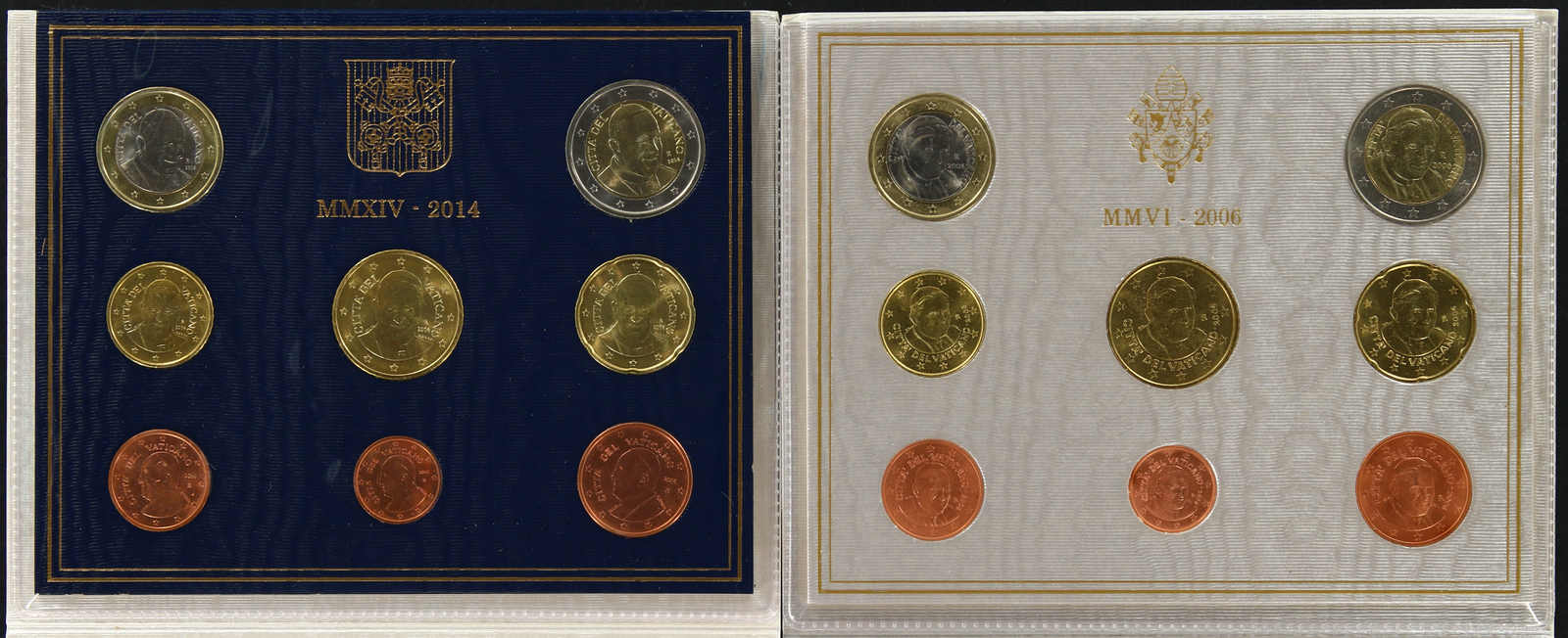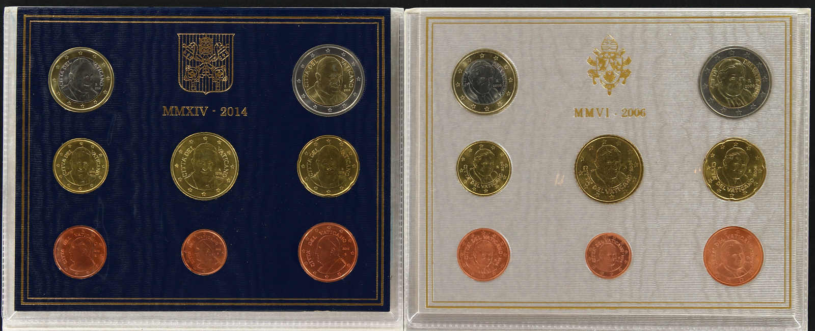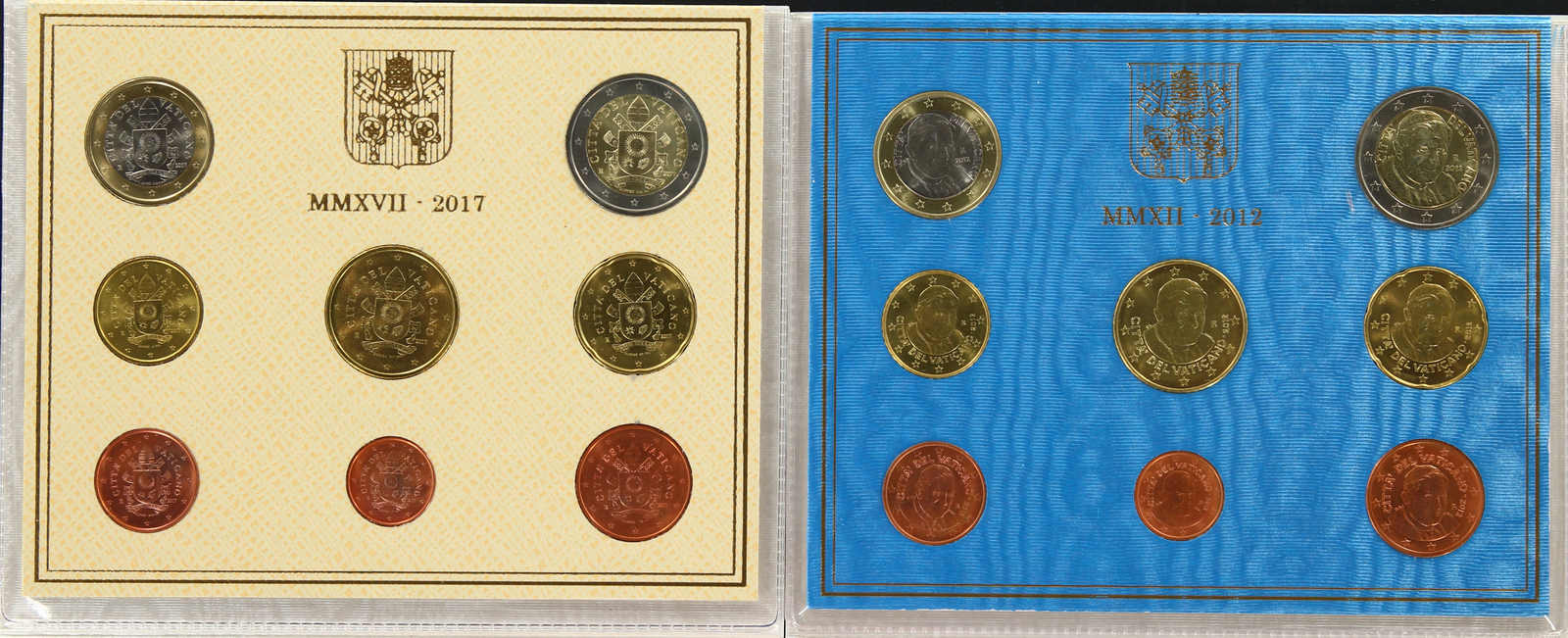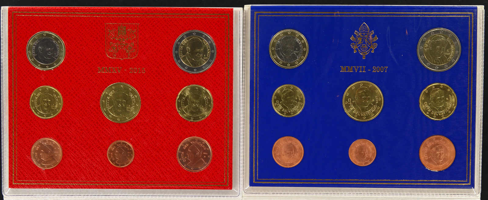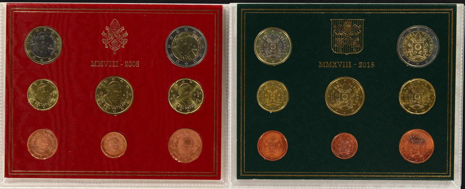 VATIKAN: 2005/2018, original KMS 2004, 2005, 2005 Sede, 2mal 2006, 2007, 2008, 2012, 2mal 2013, 2mal 2014, 2015, 2mal 2016, 2017, 2018 zusammen 17 Stück, Blister teilweise leicht bestoßen, dazu 2 Euro im Blister 2004, 2006, 2016 (Image) (imagea)