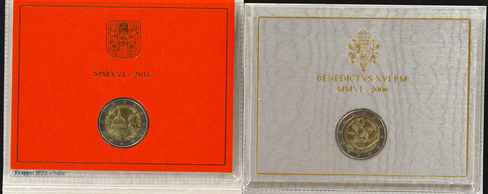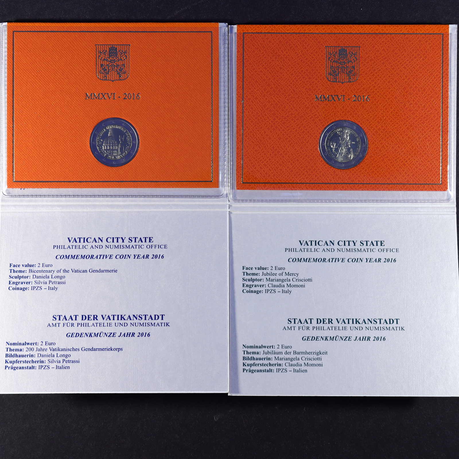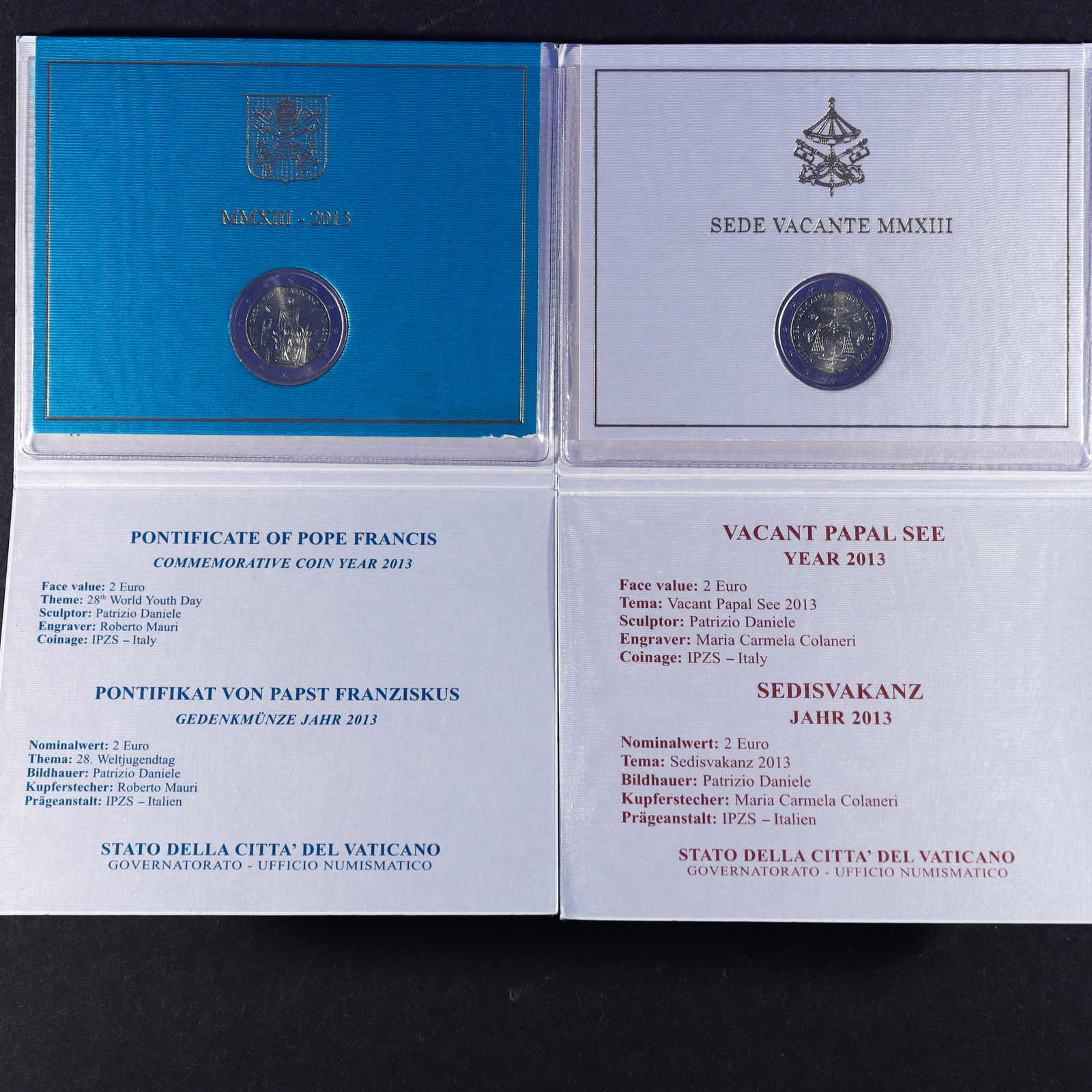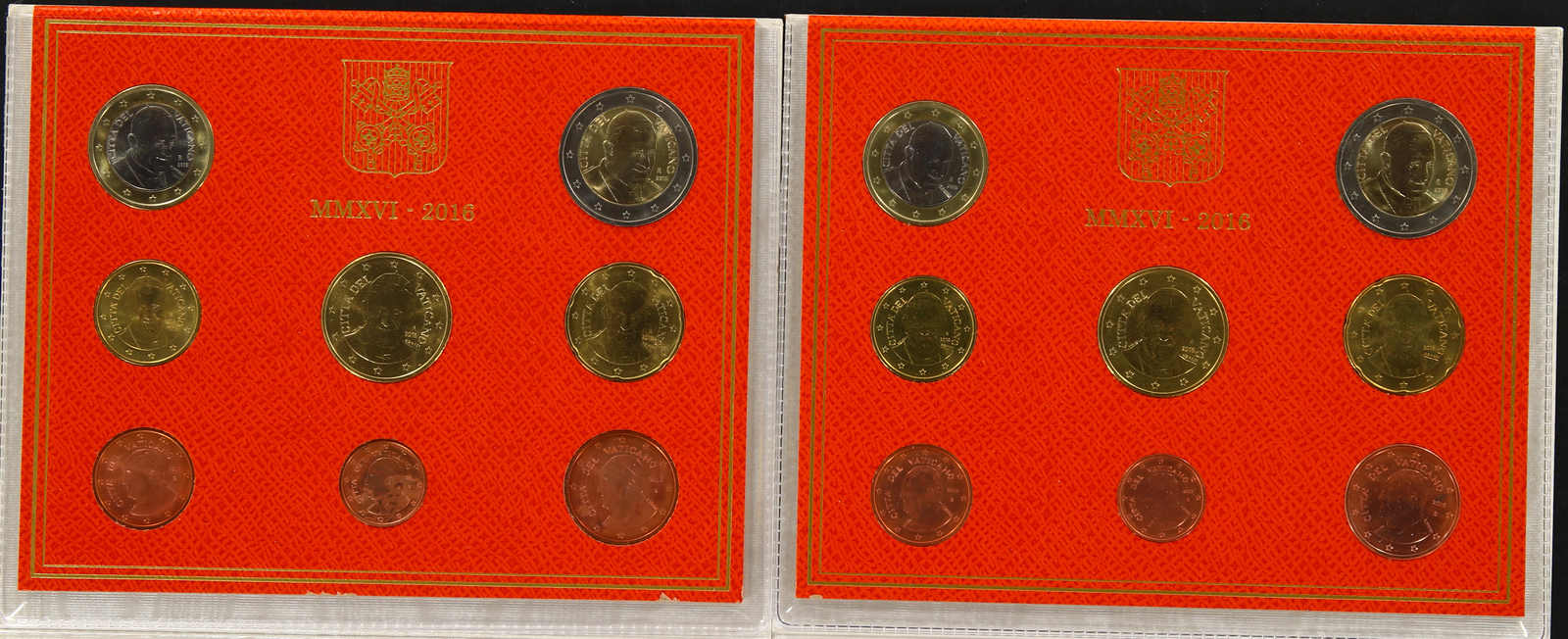 VATIKAN: 2005/2018, original KMS 2004, 2005, 2005 Sede, 2mal 2006, 2007, 2008, 2012, 2mal 2013, 2mal 2014, 2015, 2mal 2016, 2017, 2018 zusammen 17 Stück, Blister teilweise leicht bestoßen, dazu 2 Euro im Blister 2004, 2006, 2016 (Image) (imagea)