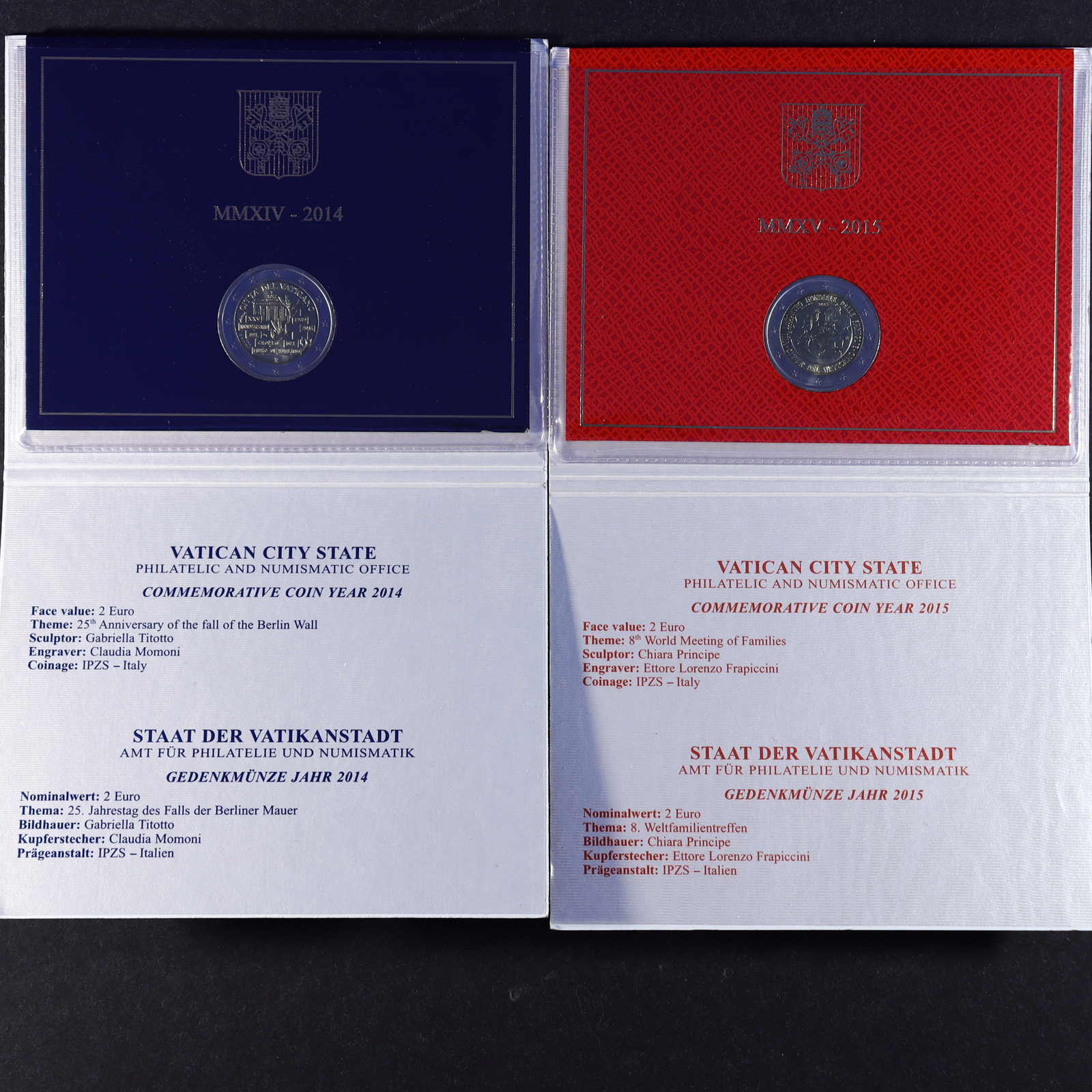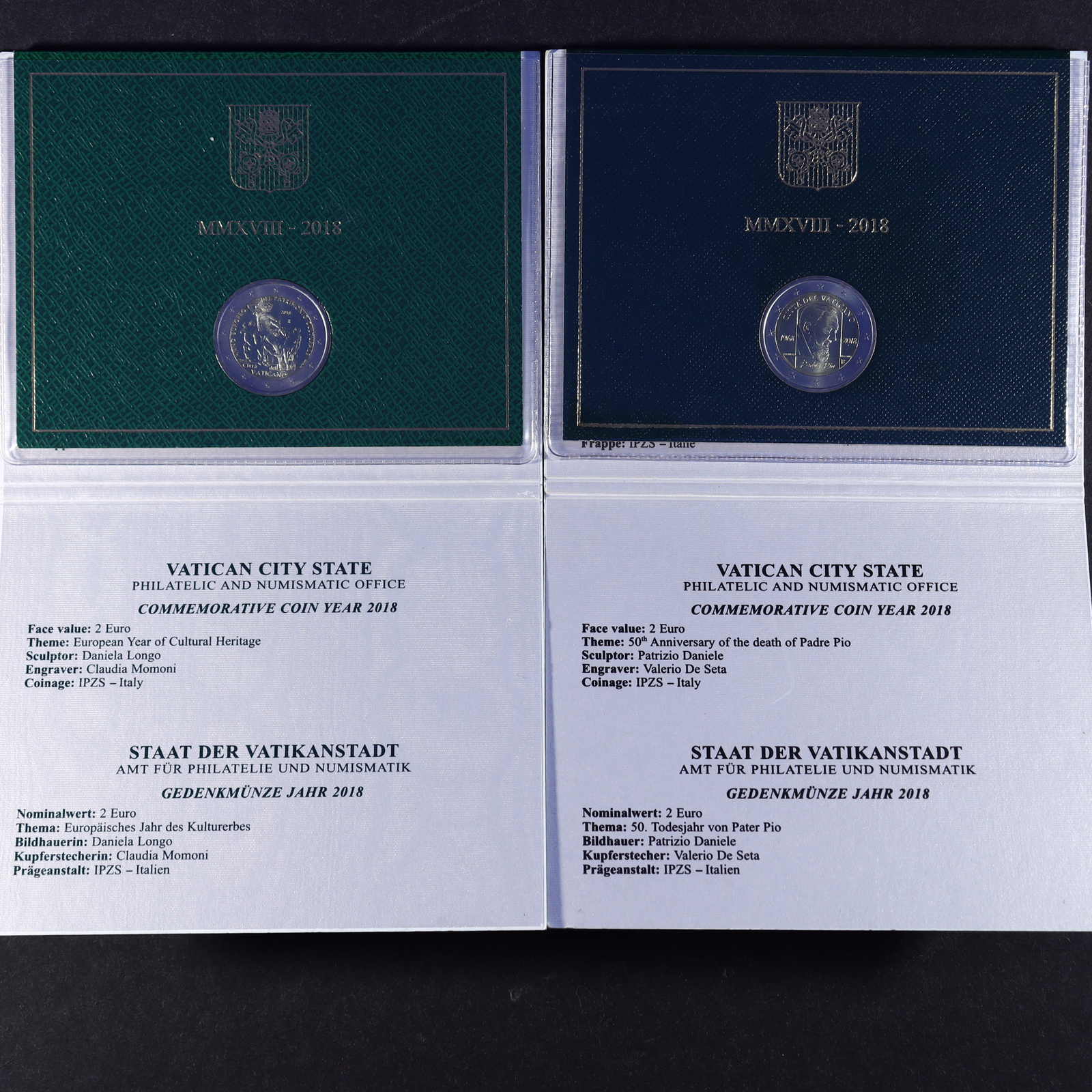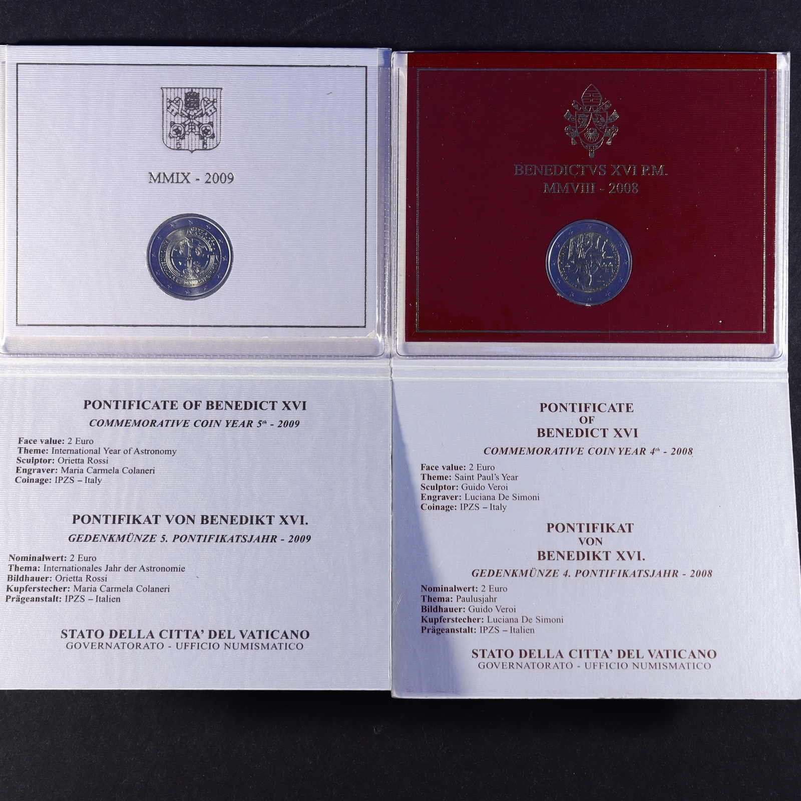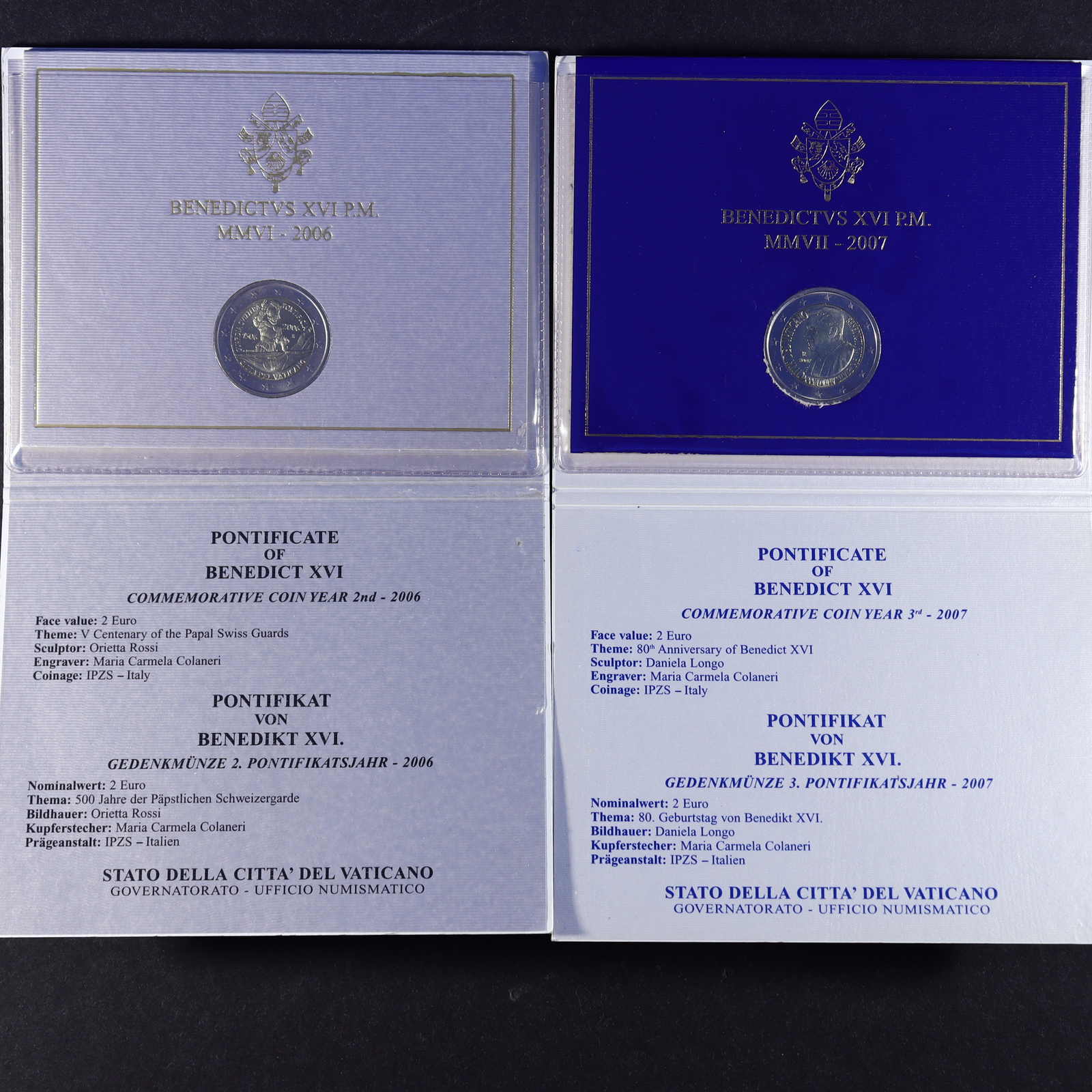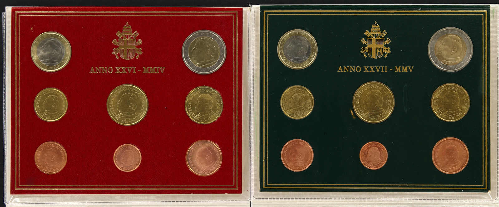 VATIKAN: 2005/2018, original KMS 2004, 2005, 2005 Sede, 2mal 2006, 2007, 2008, 2012, 2mal 2013, 2mal 2014, 2015, 2mal 2016, 2017, 2018 zusammen 17 Stück, Blister teilweise leicht bestoßen, dazu 2 Euro im Blister 2004, 2006, 2016 (Image) (imagea)