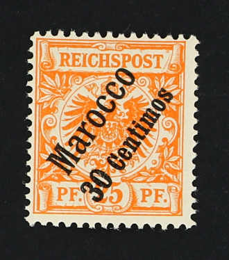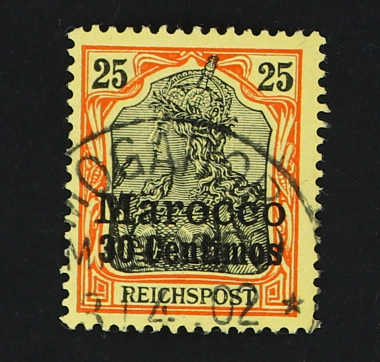 1900, 30 C. auf 25 Pfg. Aufdruckausgabe rötlichorange/gelbschwarz auf hellgelb, sog. dünner Aufdruck, mit Plattenfehler "R von REICHSPOST in der Kreuzung beschädigt, kleiner Farbpunkt zwischen R und E", sauber gestempelt "(M)OGADOR 3/4.
