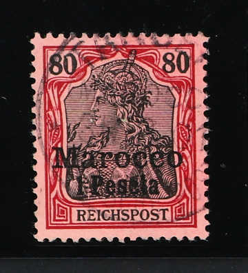 1900, 1 P. auf 80 Pfg. Aufdruckausgabe dunkelrötlichkarmin/rotschwarz auf mattkarmin, sog. dünner Aufdruck, mit Plattenfehler "0 der linken Wertangabe 80 oben links ausgebeult", gestempelt "TANGER 31/12.01", einwandfrei, Fotobefund