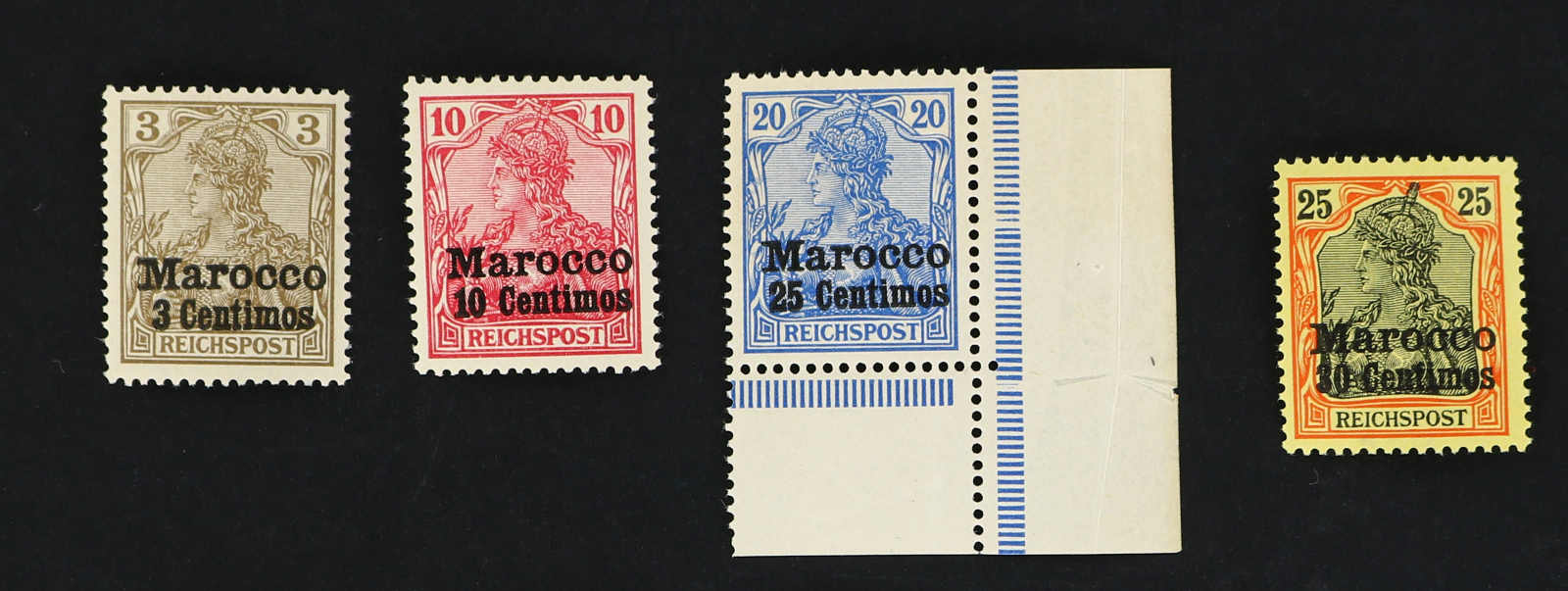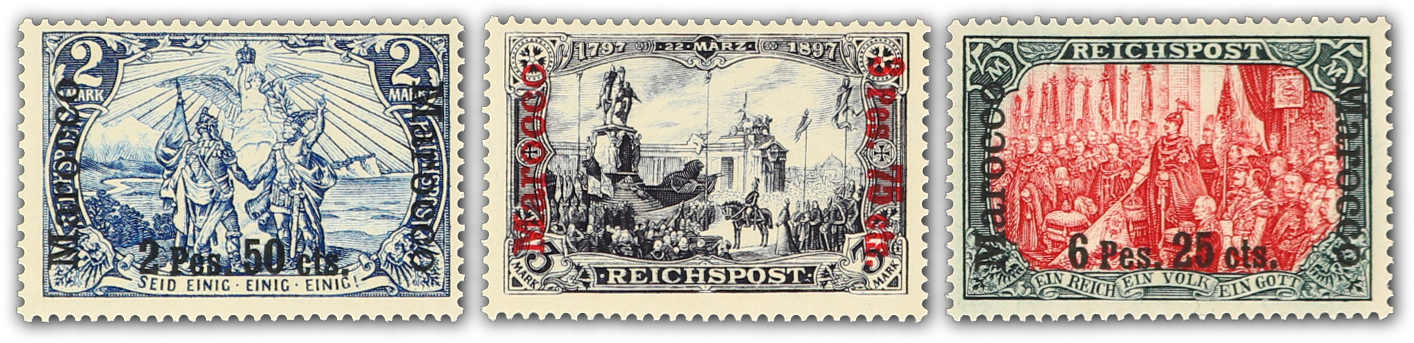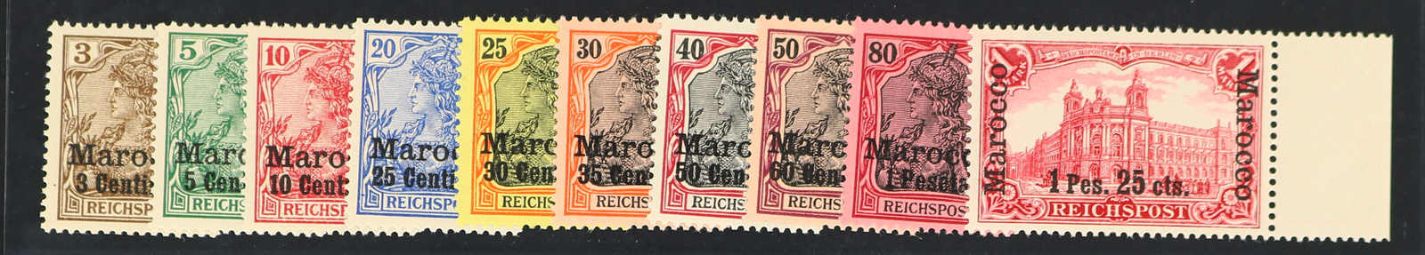 1901, 3 C. auf 3 Pfg., 5 C. auf 5 Pfg. sowie 25 C. auf 20 Pfg. bis 35 C. auf 30 Pfg. und 60 C. auf 50 Pfg. bis 6 P. 25 C. auf 5 M., gesamt 11 Werte der Aufdruckausgabe mit sog. dünnem Aufdruck, dabei der Höchstwert Type I mit nur weißer