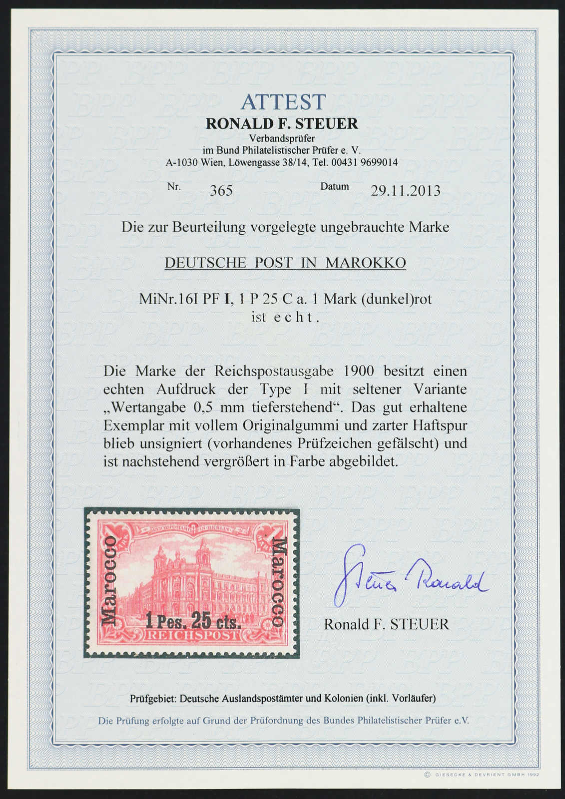 1900, 1 P. 25 C. auf 1 M. Aufdruckausgabe (dunkel)rot, sog. dünner Aufdruck, Aufdruck-Wertangabe 0,5 mm tiefer stehend, ungebraucht, farbfrisch, einwandfrei, signiert, Fotoattest Steuer BPP (ME 500,-) (Image) (imagea)