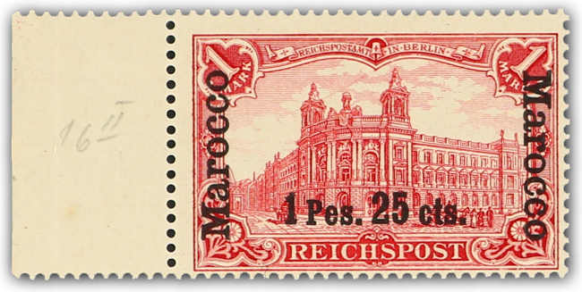 1903, 1 P. 25 C. auf 1 M. Aufdruckausgabe dunkelkarminrot, sog. fetter Aufdruck, postfrisch mit anhängendem Bogenrand (dort Falzrest und Gummibug), einwandfrei, unsigniert, Fotoattest Jäschke-Lantelme BPP (ME 1.400,-) (Image) (imagea)