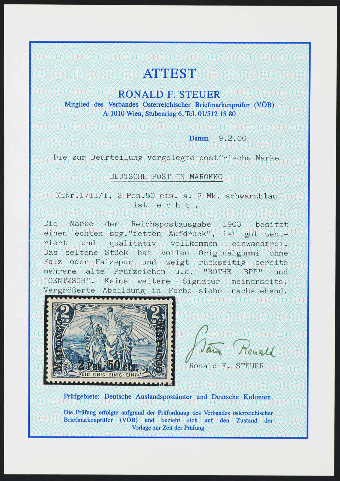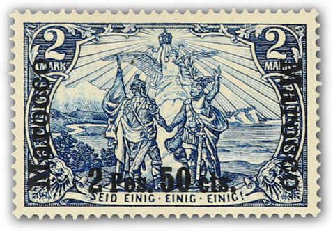 1903, 2 P. 50 C. auf 2 M. Aufdruckausgabe schwärzlichblau, sog. fetter Aufdruck, Type I, postfrisch, einwandfrei, seltene Marke!, signiert Bothe BPP und Gentzsch, Fotoattest Steuer VÖB (ME 2.800,-) (Image) (imagea)