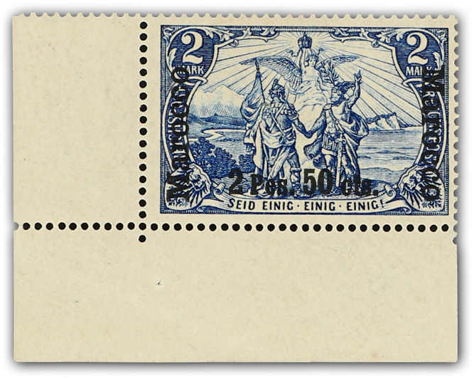 1903, 2 P. 50 C. auf 2 M. Aufdruckausgabe schwärzlichblau, sog. fetter Aufdruck, Type I, ungebrauchtes Exemplar aus der unteren linken Ecke, einwandfrei, signiert u.a. Bothe, Fotoattest Jäschke-Lantelme BPP (ME 650,-) (Image) (imagea)