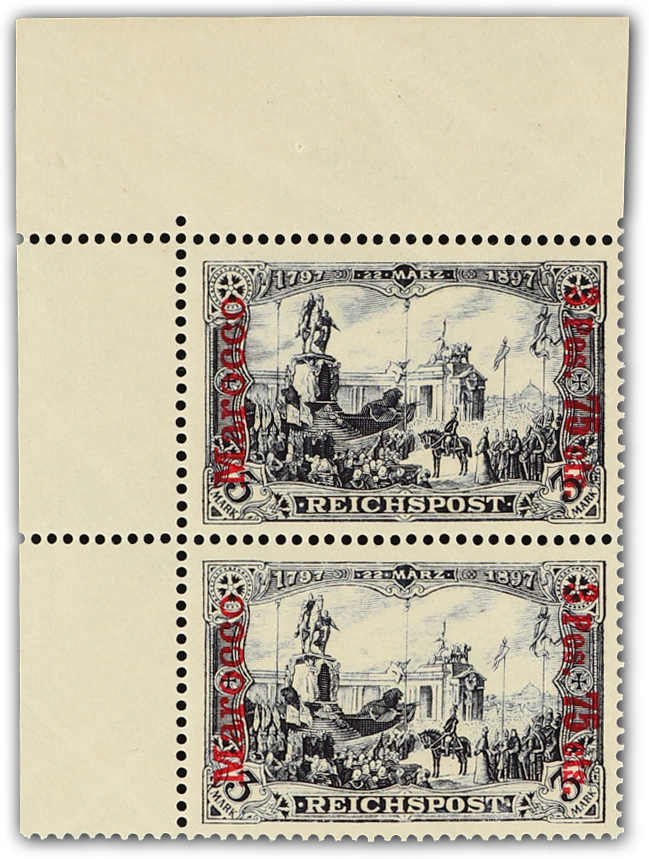 1900, 3 P. 75 C. auf 3 M. violettschwarz Germania, postfrisches Typenpaar der Urmarke aus der oberen linken Bogenecke, dabei der obere Wert in der Drucktype "I" und der untere Wert in der Drucktype "II", farbfrisch und gut gezähnt,