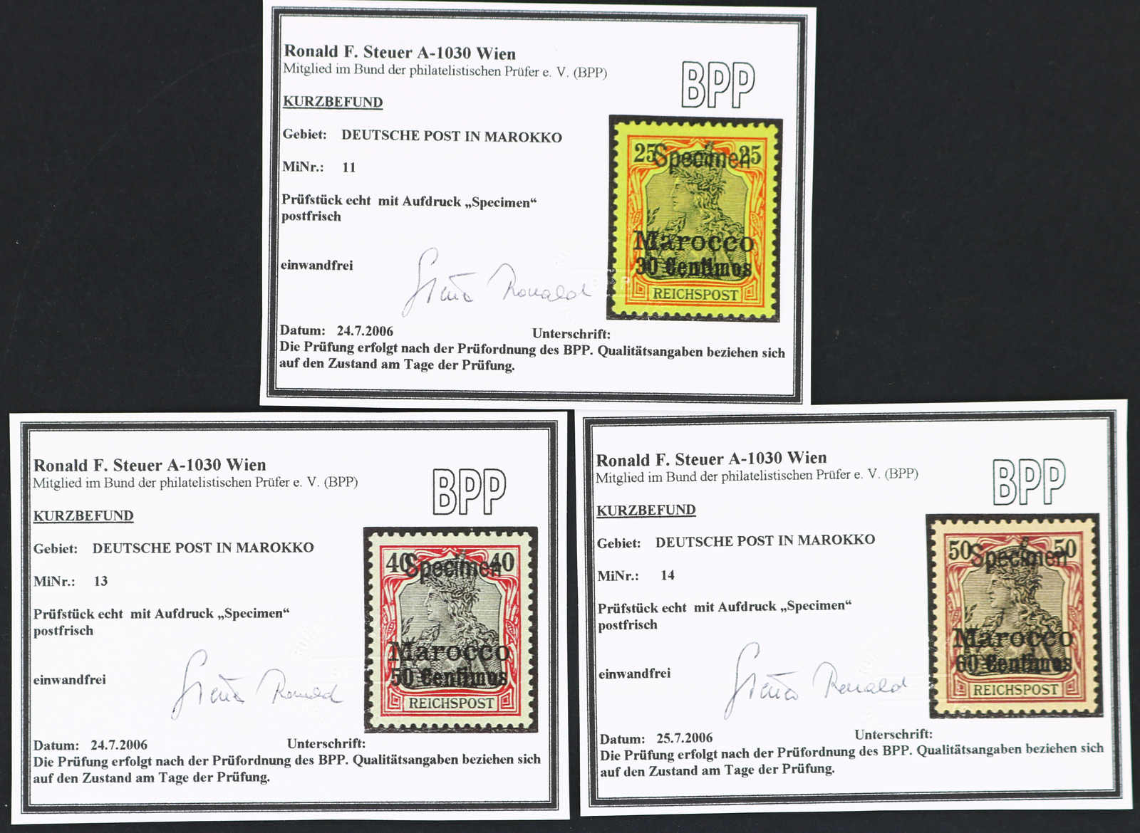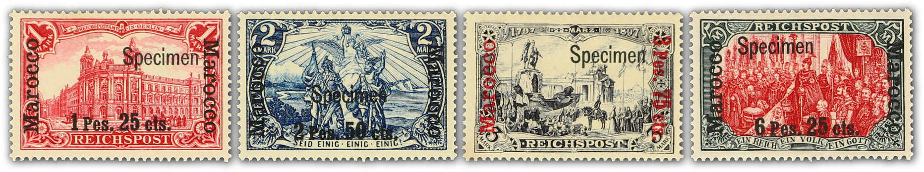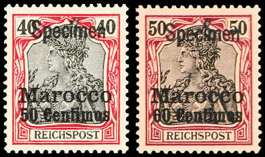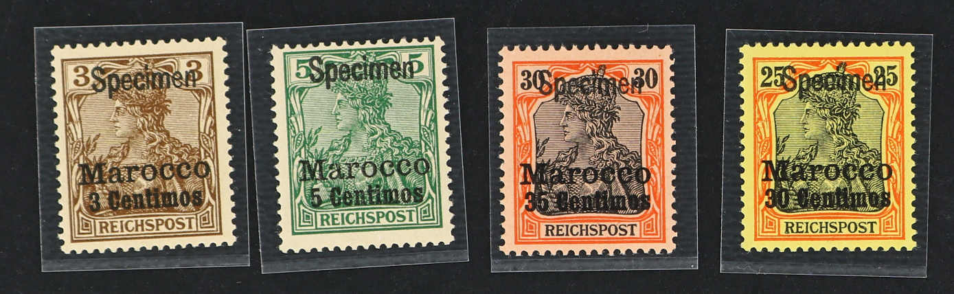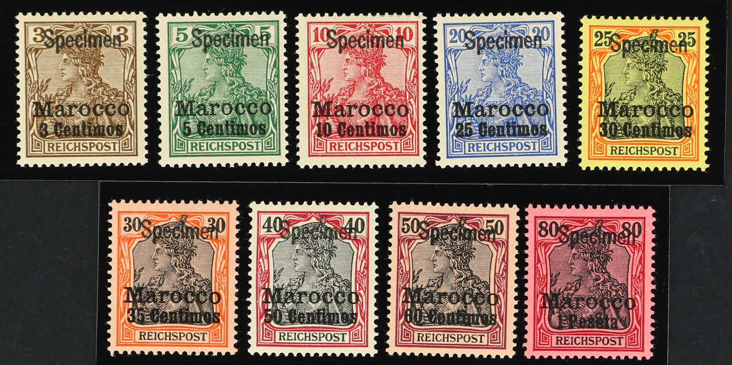 1900/03, 3 C. auf 3 Pfg., 5 C. auf 5 Pfg. sowie 30 C. auf 25 Pfg. bis 60 C. auf 50 Pfg., gesamt sechs Werte der Aufdruckausgabe, je mit Aufdruck "Specimen", postfrisch, einwandfrei, je Kurzbefund Steuer BPP (außer für die 35 C.) (ME
