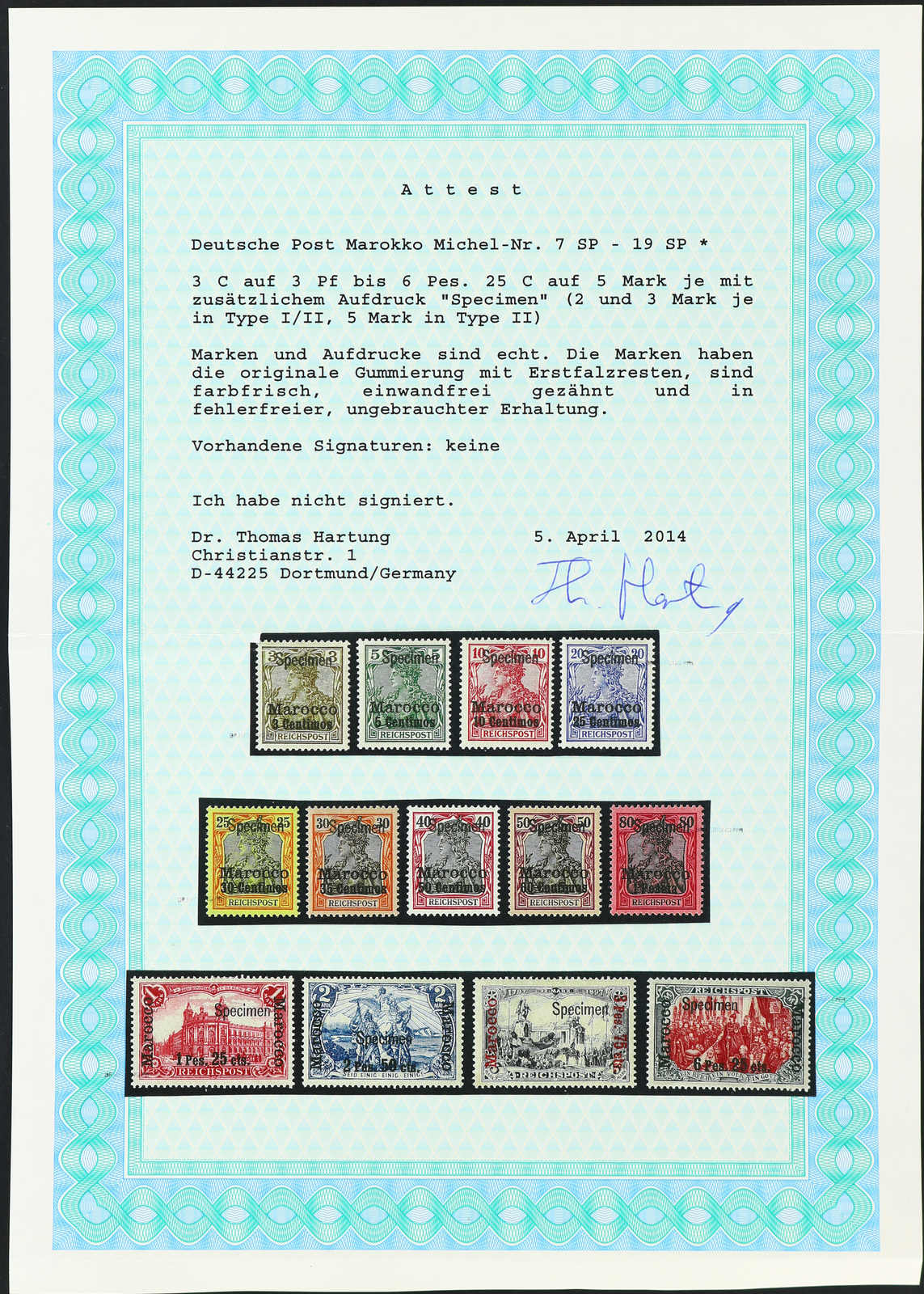 1900/03, 3 C. auf 3 Pfg. bis 6 P. 25 C. auf 5 M. Aufdruckausgabe, der komplette Satz mit Aufdruck "Specimen", dabei der Höchstwert mit sog. fettem Aufdruck, ungebraucht, farbfrisch, einwandfrei, Fotoexpertise Dr. Hartung (ME 2.480,-) (Image) (imagea)