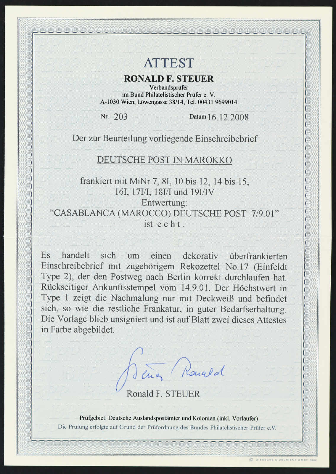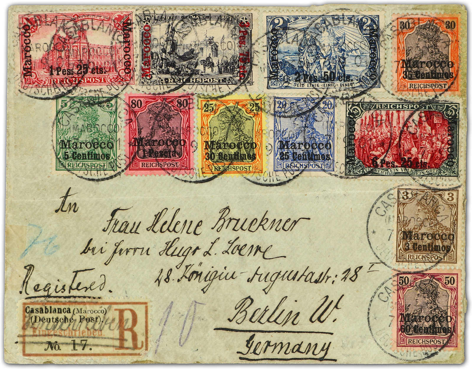 Nachmalung, klar entwertet "CASABLANCA (MAROCCO) DEUTSCHE POST 7/9.01" auf überfrankiertem R-Brief nach Berlin mit rückseitigem Ankunftsstempel, gute Bedarfsqualität, Umschlag fleckig, Fotoattest Steuer BPP (ME ca. 1.500,-) (Image) (imagea)