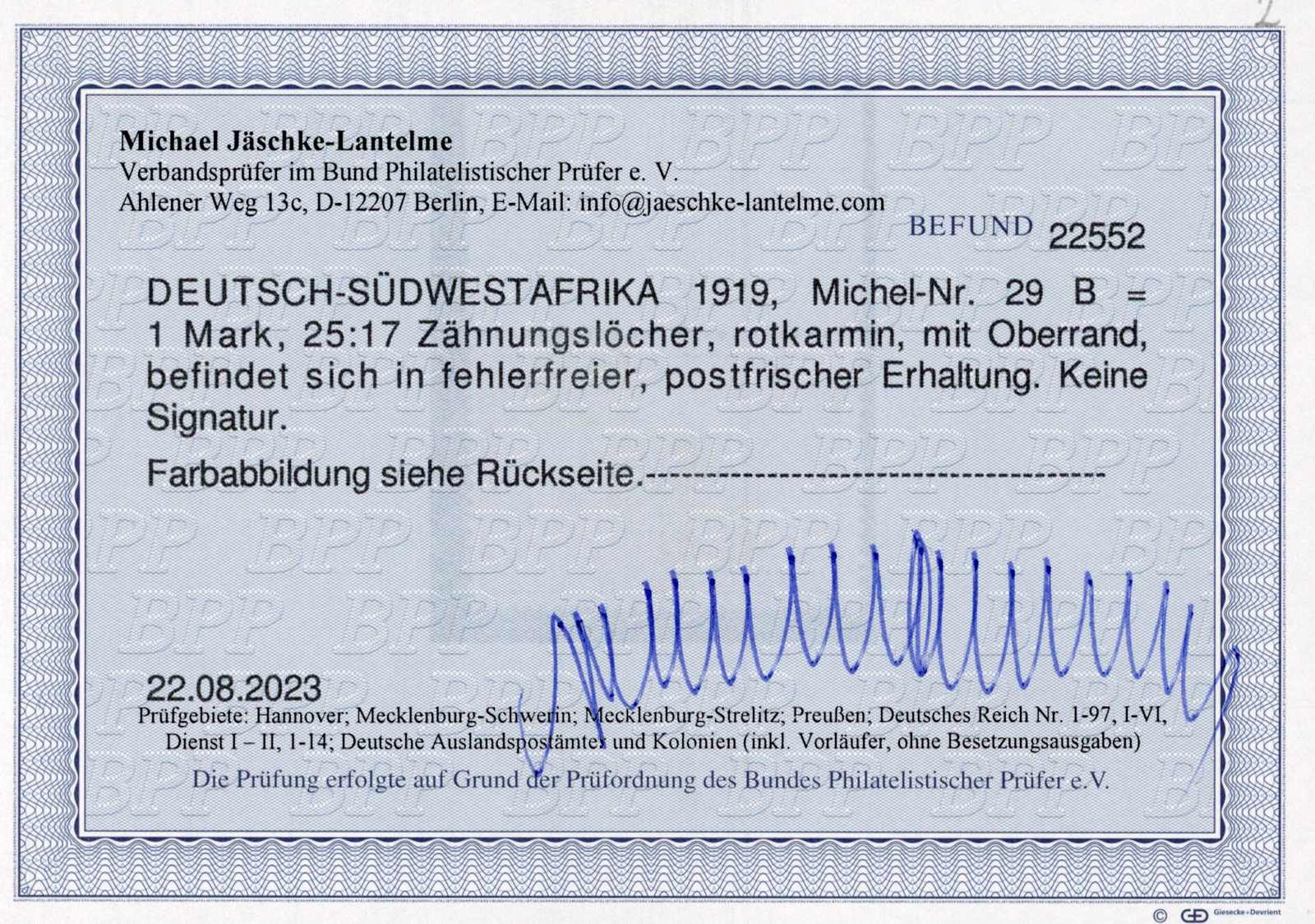 1919, 1 M. rotkarmin vom Oberrand, 25:17 Zähnungslöcher, postfrisch, einwandfrei, unsigniert, Fotobefund Jäschke-Lantelme BPP 08/2023 (ME 320,-)