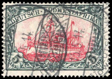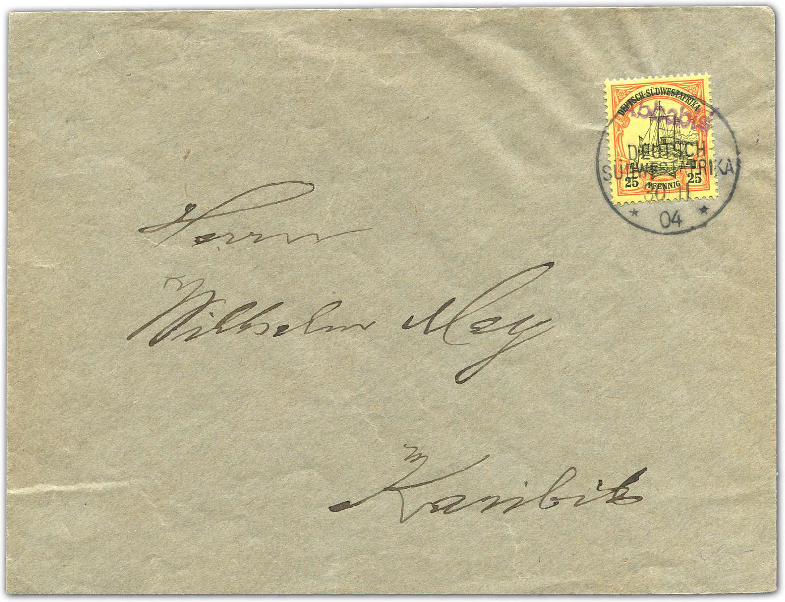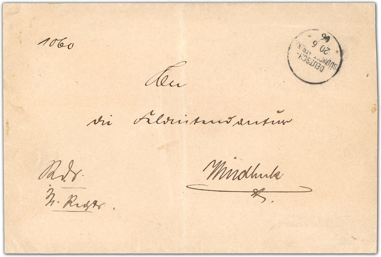 "DEUTSCH-SÜDWESTAFRIKA 20.6.06", schwarzer Wanderstp. der Type V ohne den Einsatzstp. "Otjiwarongo" (aptiert aus Uhabis), als Aufgabestp. auf portofreier R.D.S. nach Windhuk, senkrechte Faltung, sonst gute Qualität, ungewöhnliche
