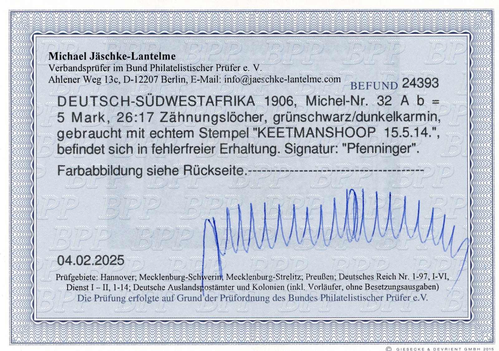 1906, 5 M. Kaiseryacht im Friedensdruck grünschwarz/dunkelkarmin gestempelt, einwandfreie Qualität, signiert Pfenninger, Fotobefund Jäschke-Lantelme BPP 02/2025 (ME 450,-) (Image) (imagea)