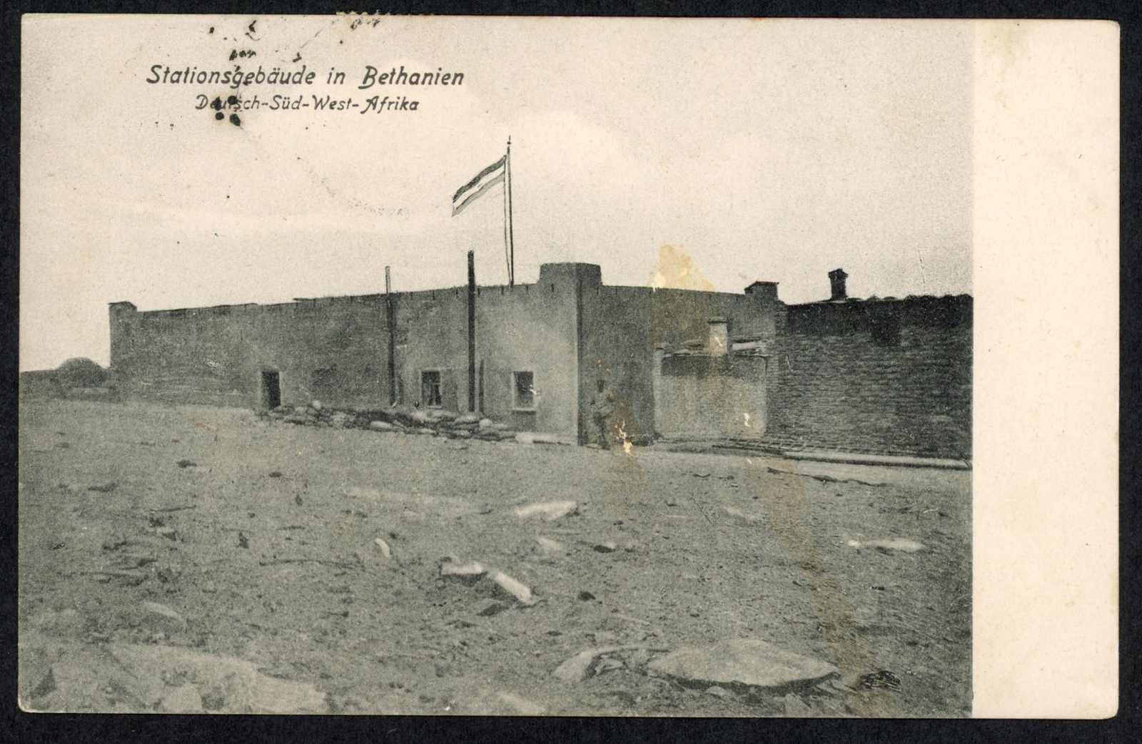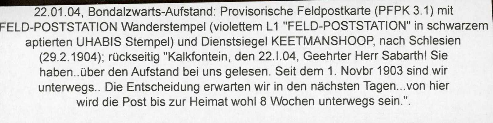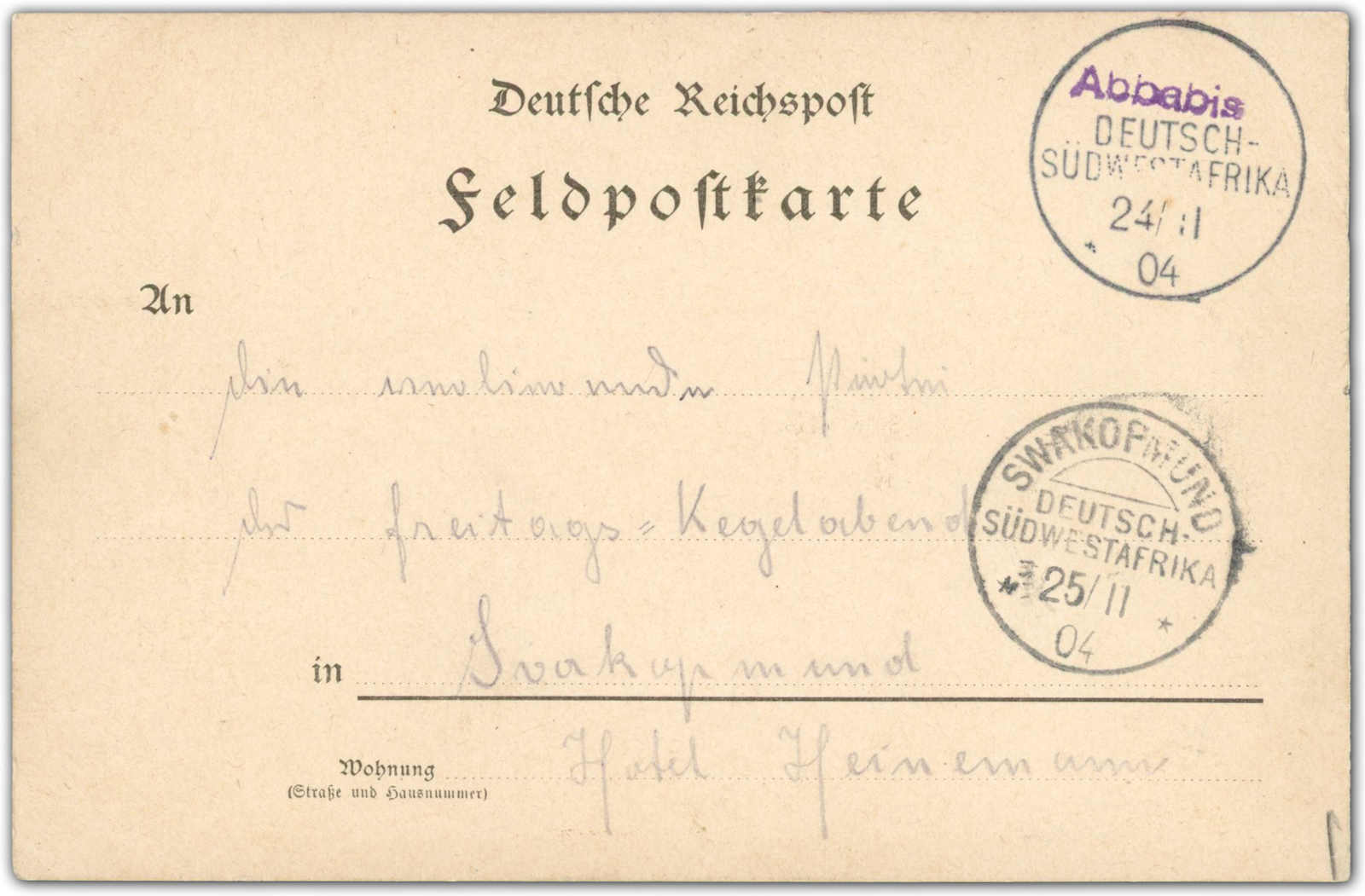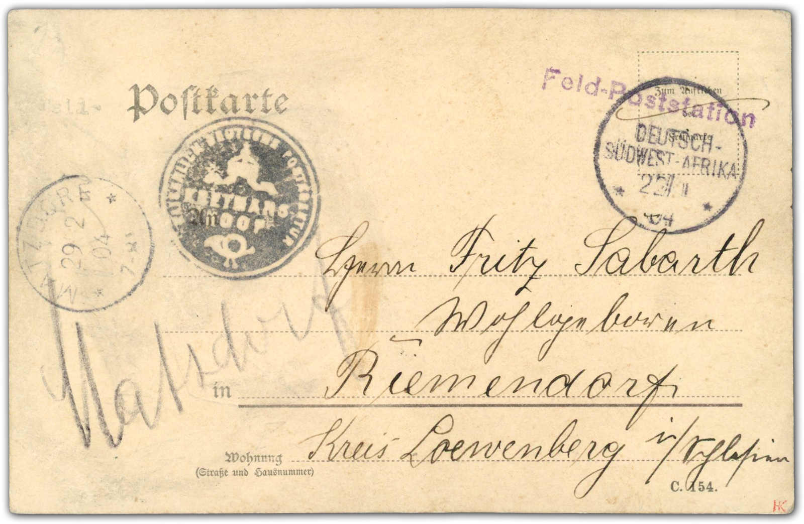 Portofreiheit das Dienstsiegel des Postamtes von Keetmanshoop abgeschlagen, vorderseitig mit Ankunftstp. vom 29.2.04, eine seltene Karte aus dem Bondelzwarts-Aufstand, etwas Beförderungsspuren, sonst einwandfrei (AG 1.600,-) (Image) (imagea)
