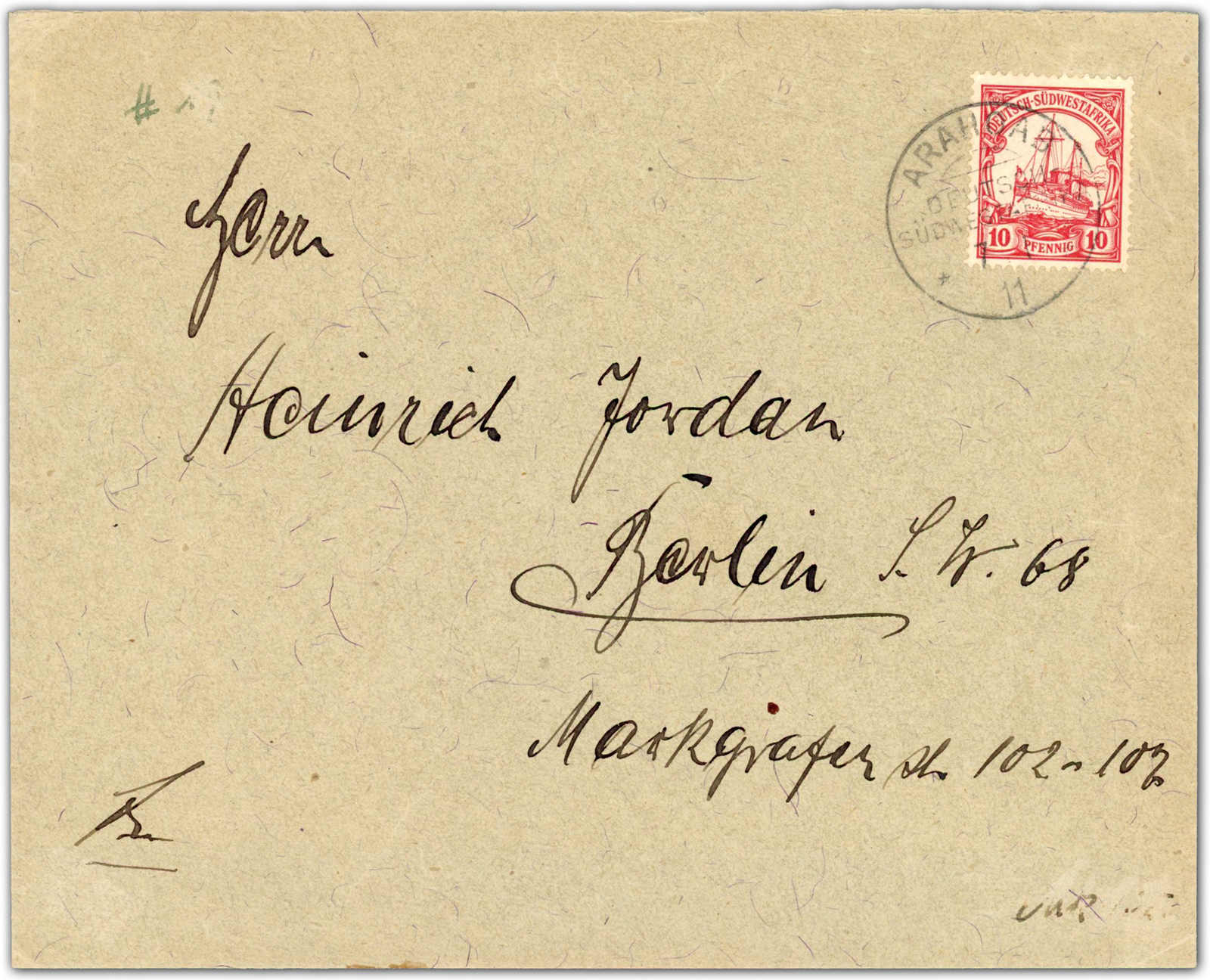"ARAHOAB DEUTSCH-SÜDWESTAFRIKA 7.1.11", klarer Abschlag als Entwertungsstp. auf portogerechtem Brief nach Deutschland, frankiert mit 10 Pfg. Kaiseryacht, vorderseitig minimale Schürfung, sonst einwandfrei (AG 200,- Euro) (Image)