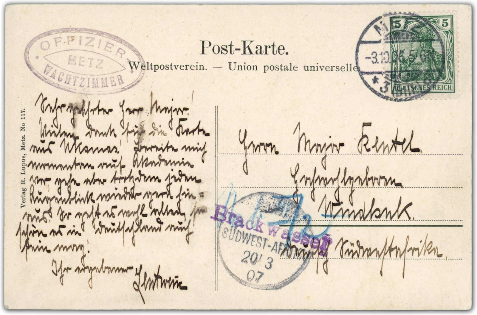 "Brackwasser", violetter Gummistp. eingestempelt in schwarzen Wanderstp. Type I vom 20.3.07, klarer Abschlag als Durchgangsstp. auf ankommender Postkarte aus METZ/Deutschland., frankiert mit 5 Pfg. Germania, adressiert nach Windhuk,