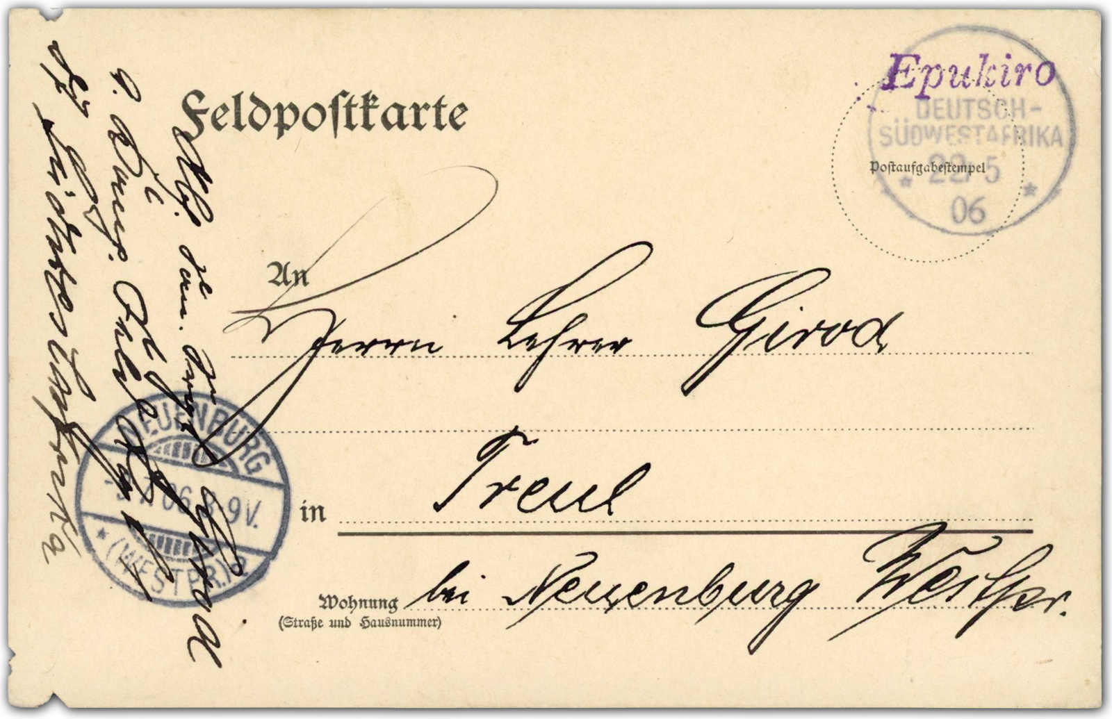 "Epukiro", violetter Gummistp. eingestempelt in schwarzen Wanderstp Type III, als Aufgabestp. auf portofreier Feldpost-Karte vom 22.5.06, adressiert nach Deutschland, einwandfrei (AG 160,-) (Image)