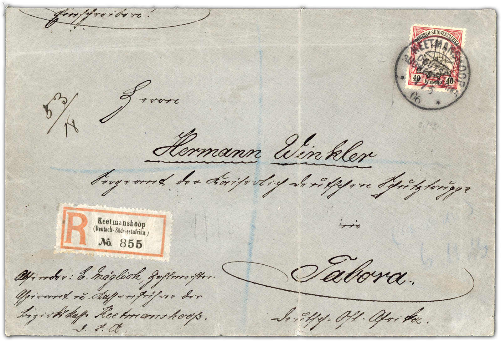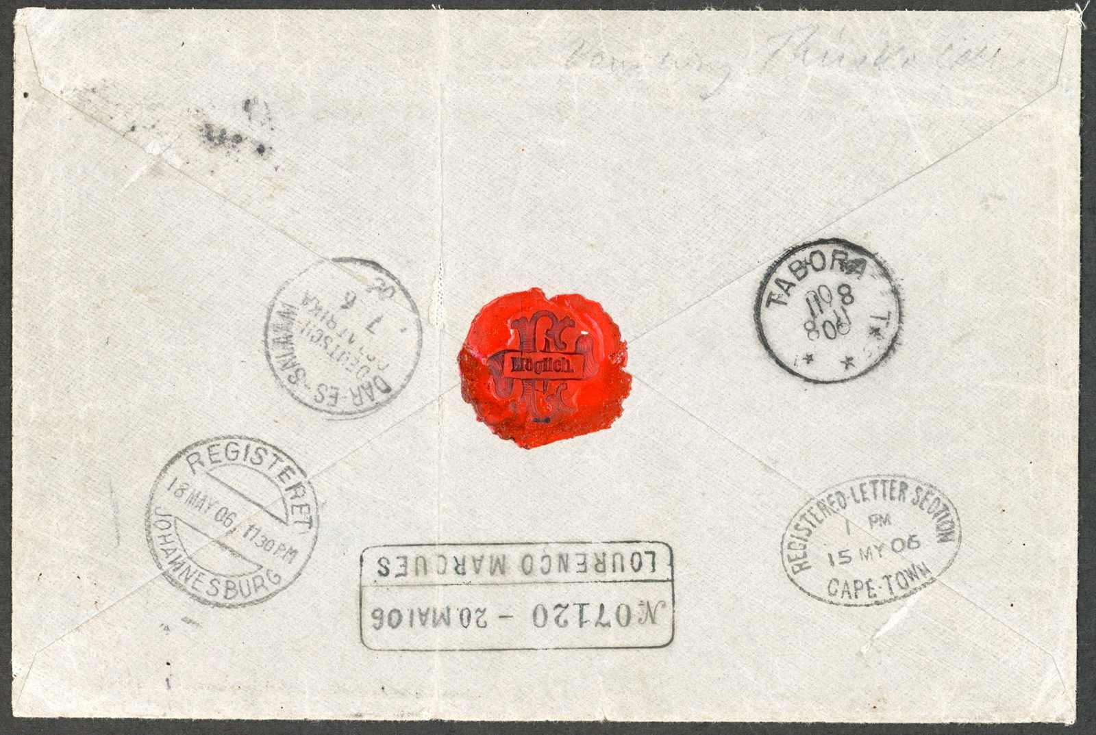 1906, 40 Pfg. Kaiseryacht als Einzelfrankatur auf Einschreib-Doppelbrief, aufgegeben "KEETMANSHOOP DEUTSCH-SÜDWESTAFRIKA 1.5.06", adressiert nach Tabora DOA, befördert über Cape Town, Johannesburg, Lorengo Marcues und Dar-Es-Salaam,