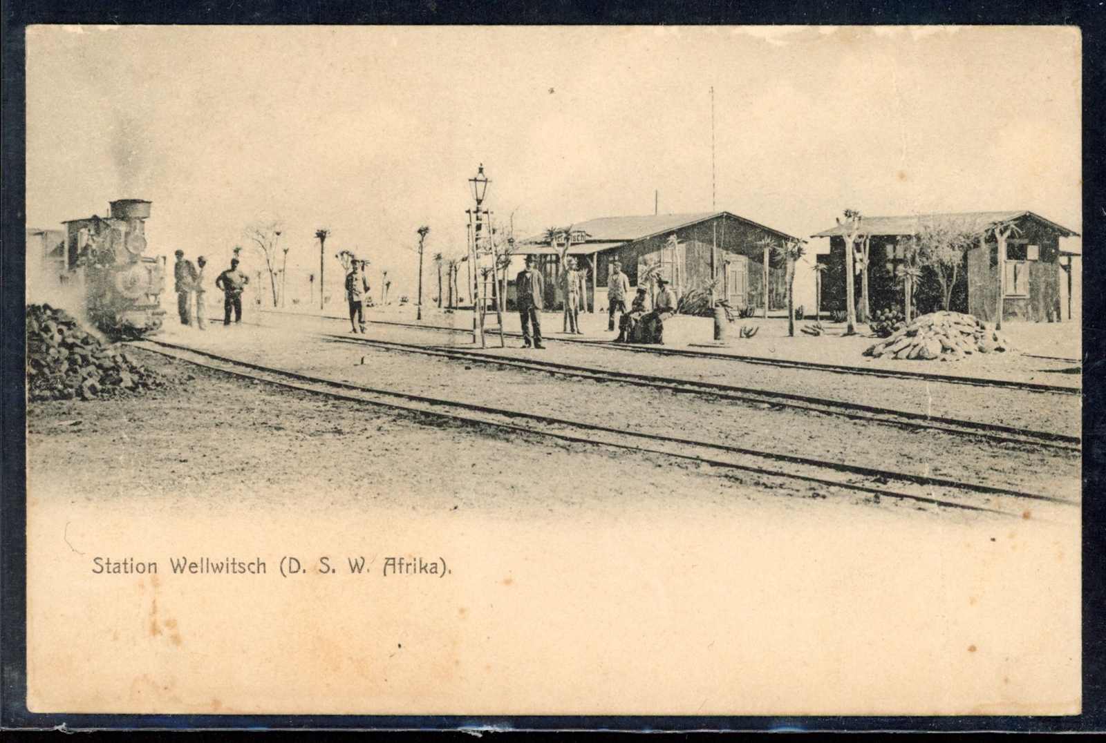 Wellwitsch, Station der Bahnstrecke Swakopmund-Windhoek bei km 63, ungebrauchte Ansichtskarte, rückseitig Klebespuren, senkrechter Bug und Altersspuren