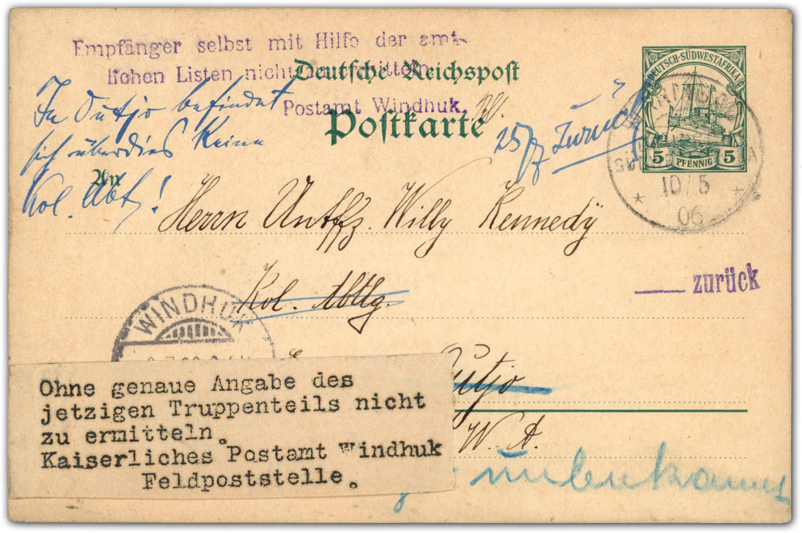 ermitteln und das wurde mit einem violetten L3 "Empfänger selbst mit Hilfe der amtlichen Listen nicht ausfindig zu machen Postamt Windhuk" bestätigt, zusätzlich beigeklebter hektographierter Zettel "Ohne genaue Angabe des jetzigen Truppenteils nicht