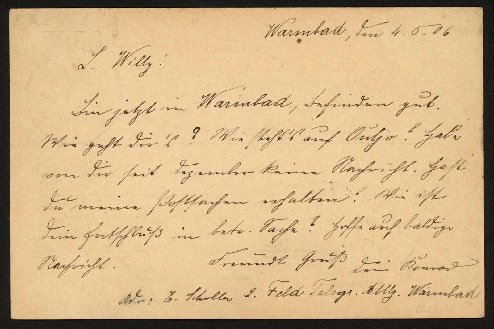 1906, 5 Pfg. Ganzsachen-Postkarte Kaiseryacht, bedarfsgebraucht im Inland, aufgegeben "WARMBAD 19.5.06", adressiert an einen Uffz. in Outjo, dort unbekannt und weitergeleitet nach Windhuk, auch in Windhuk war der Adressat nicht zu