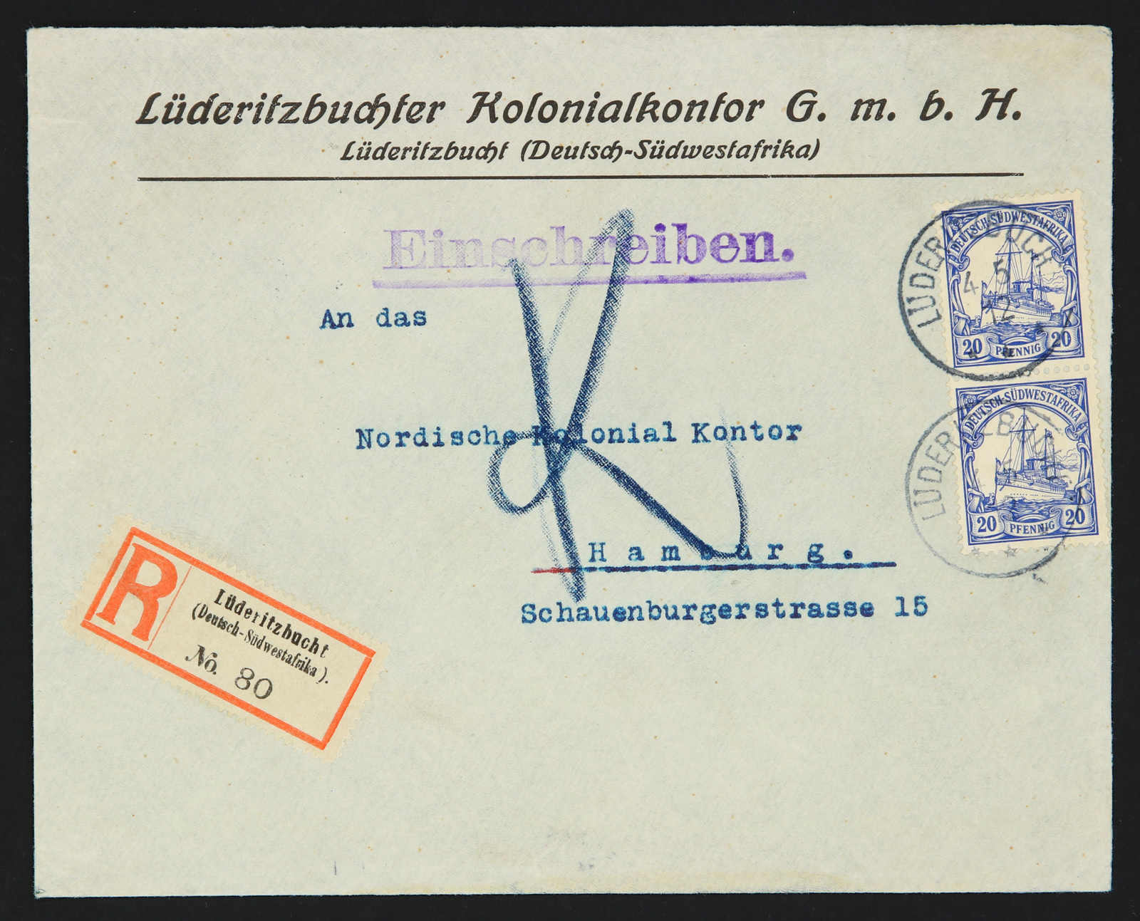 1912, Brief mit 2mal 20 Pfg. Kaiseryacht auf Vordruckumschlag der "Lüderitzbuchter Kolonialkontor GmbH" ab "LÜDERITZBUCHT 4 5 12" nach Hamburg (5.6.12), sehr gute Qualität (Image) (imagea)