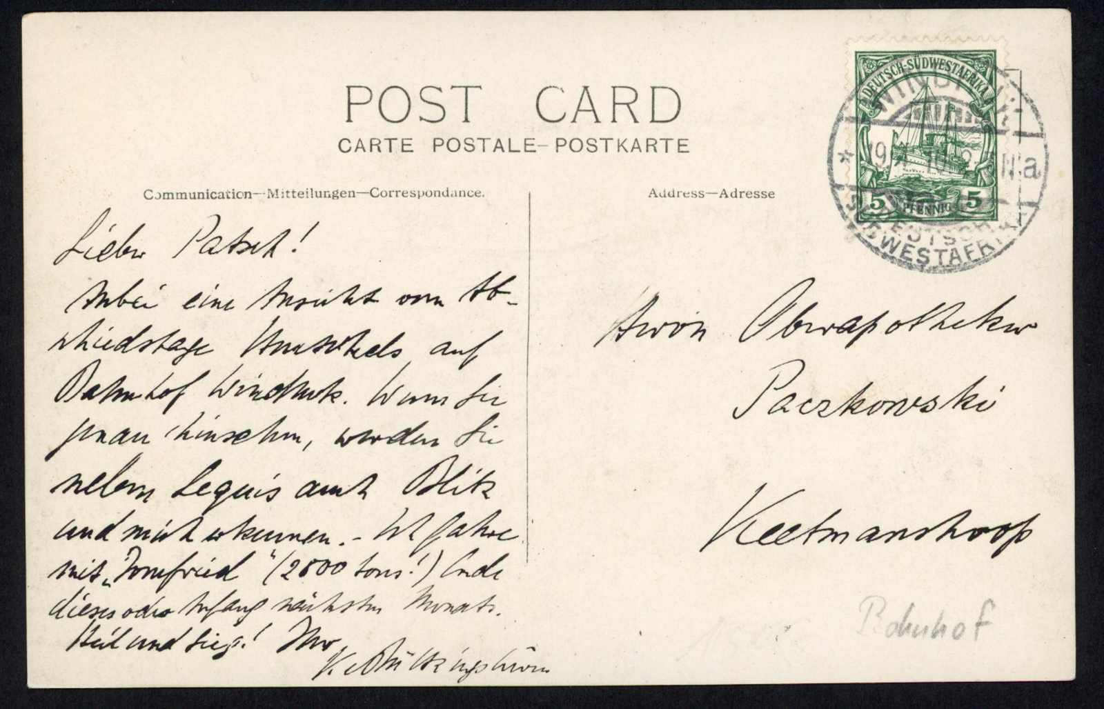 1910, 5 Pfg. Kaiseryacht als Einzelfr. auf priv. Fotokarte mit rücks. Abbildung des Bahnhofsgeländes mit Zug und Abschiedsgesellschaft von Windhuk, als Inlandspostkarte nach Keetmanshoop adressiert, saubere Qualität (Image) (imagea)