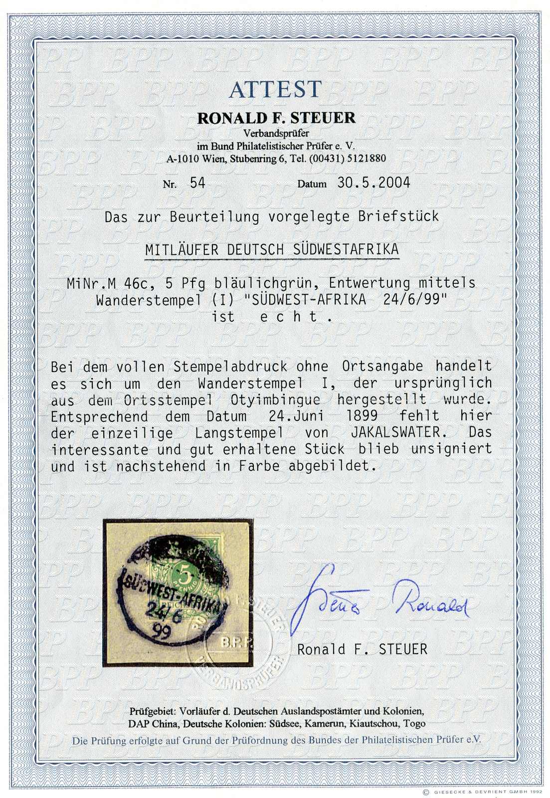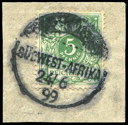 "Wanderstempel I" ohne Ortsangabe, der ursprünglich aus dem Ortsstempel "OTYIMBINGUE DEUTSCH-SÜDWESTAFRIKA" hergestellt wurde, entsprechend dem Datum vom 24.6.99 fehlt der Einzeiler "JAKALSWATER", auf kl. Briefstück mit Mi-Nr. M 46 c