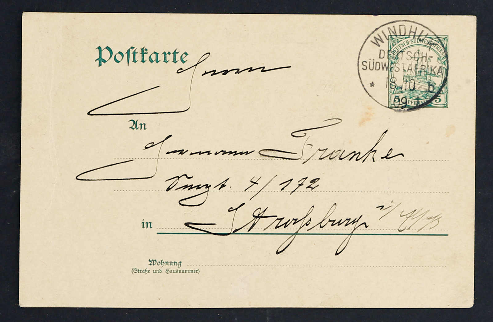 "WINDHUK b DEUTSCH-SÜDWESTAFRIKA 18.10.09" als klarer Aufgabestp. auf Bedarfpostkarte (P 18), adressiert nach Straßburg, einwandfrei (Image)