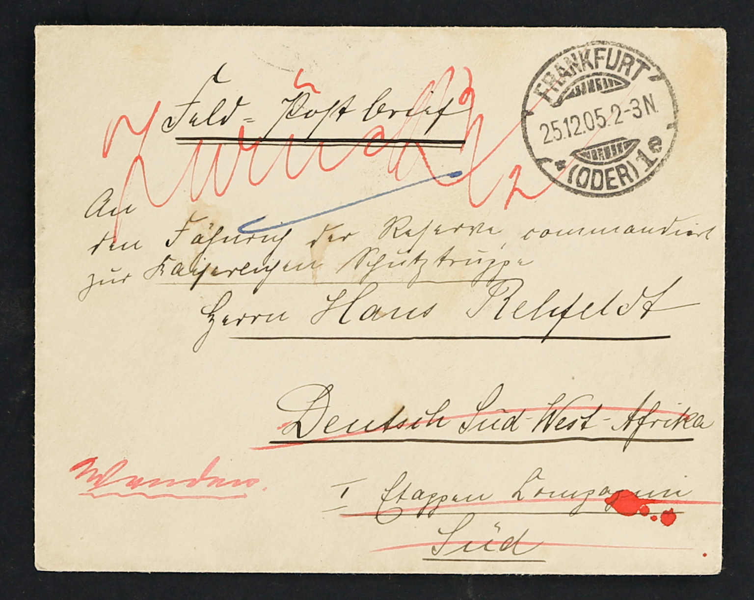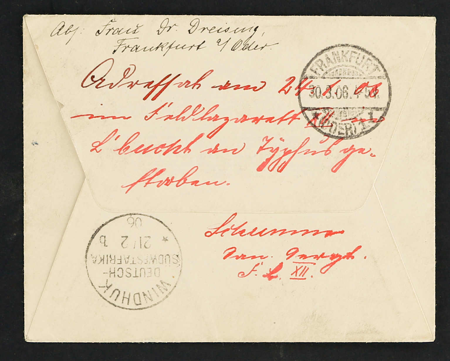 "WINDHUK b DEUTSCH-SÜDWESTAFRIKA 21.2.06" klarer Abschlag als Ankunftsstp. auf eingehendem Brief aus Deutschland mit handschr. "Zurück" Vermerk, einwandfrei (Image) (imagea)