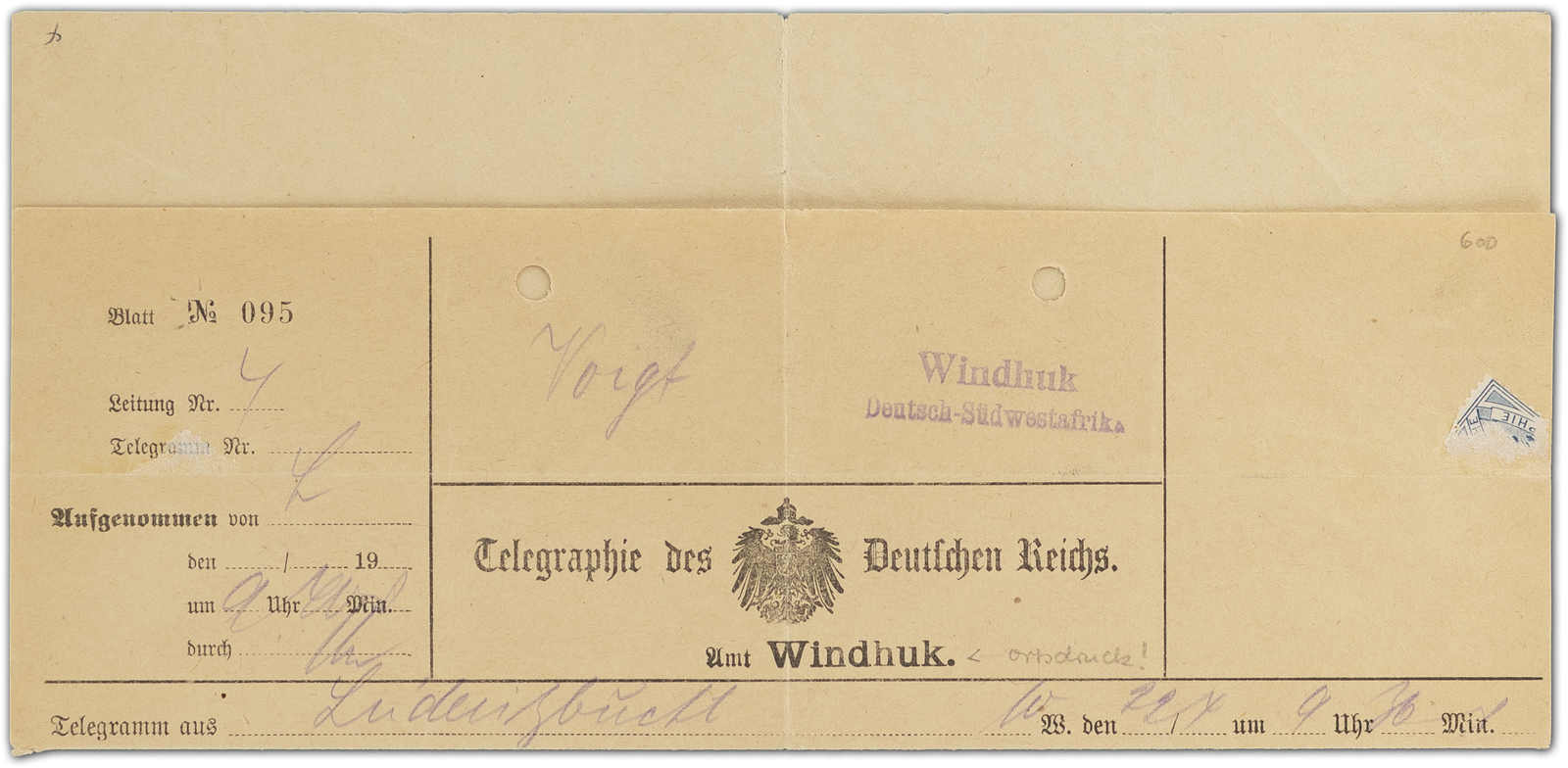 "Windhuk Deutsch-Südwestafrika", violetter Zweizeiler (Innendienststp.) auf Telegramm aus Lüderitzbucht ohne Datumsangabe, der Vordruck C 187 mehrfach gefaltet und oben Aktenlochung, sonst gute Qualität (Image)