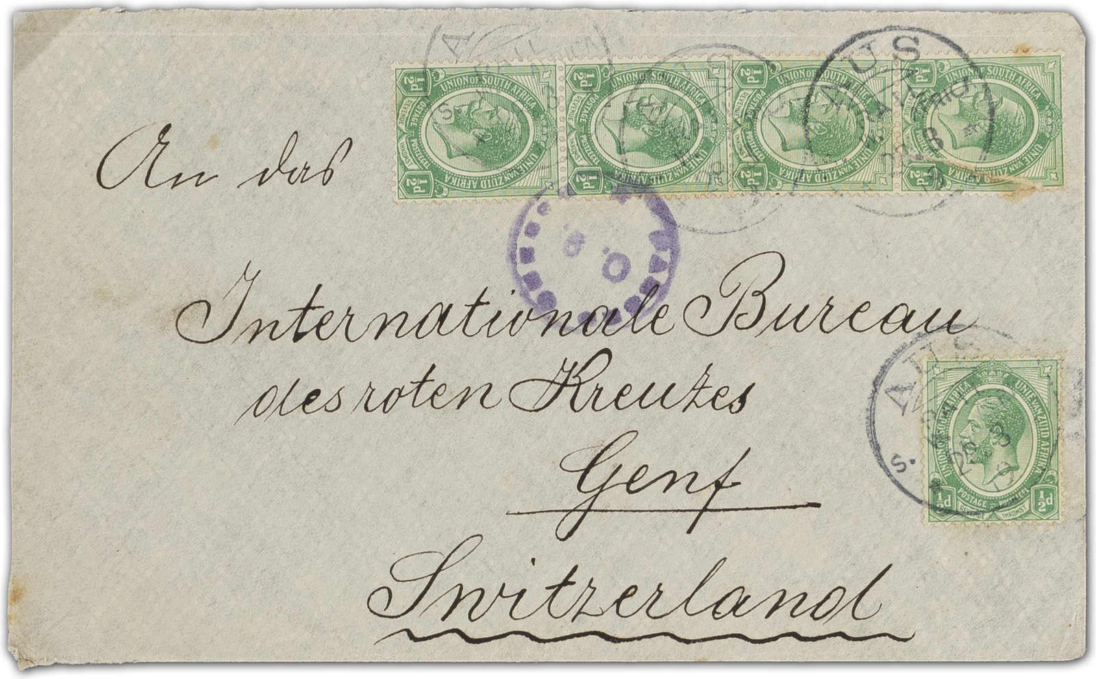 "AUS RAIL S.W.AFRICA28.3.19", der apt. deutsche Stempel "AUS DEUTSCH-SÜDWESTAFRIKA" als Entwertung (4 Abschläge) auf portogerechtem Brief an das Rote Kreuz in Genf, vorderseitig mit Zensur, Frankatur Südafrika Mi-Nr. 2 (5), davon ein Wert