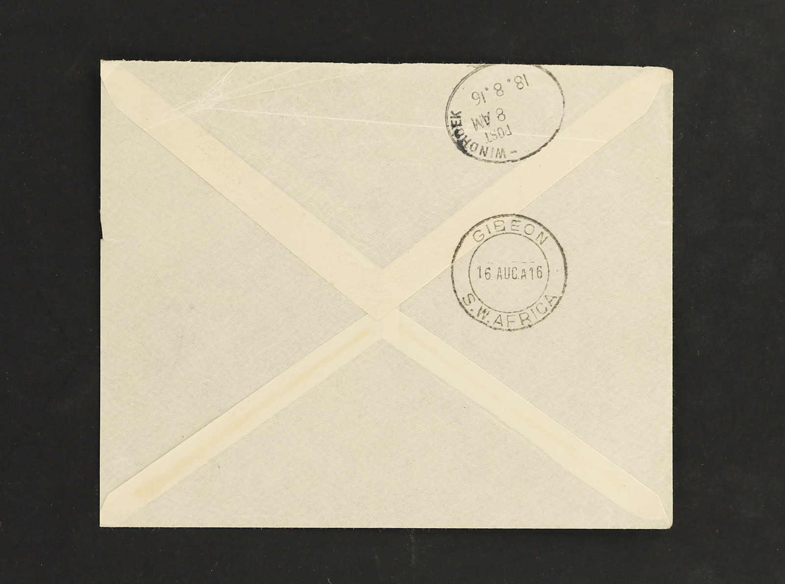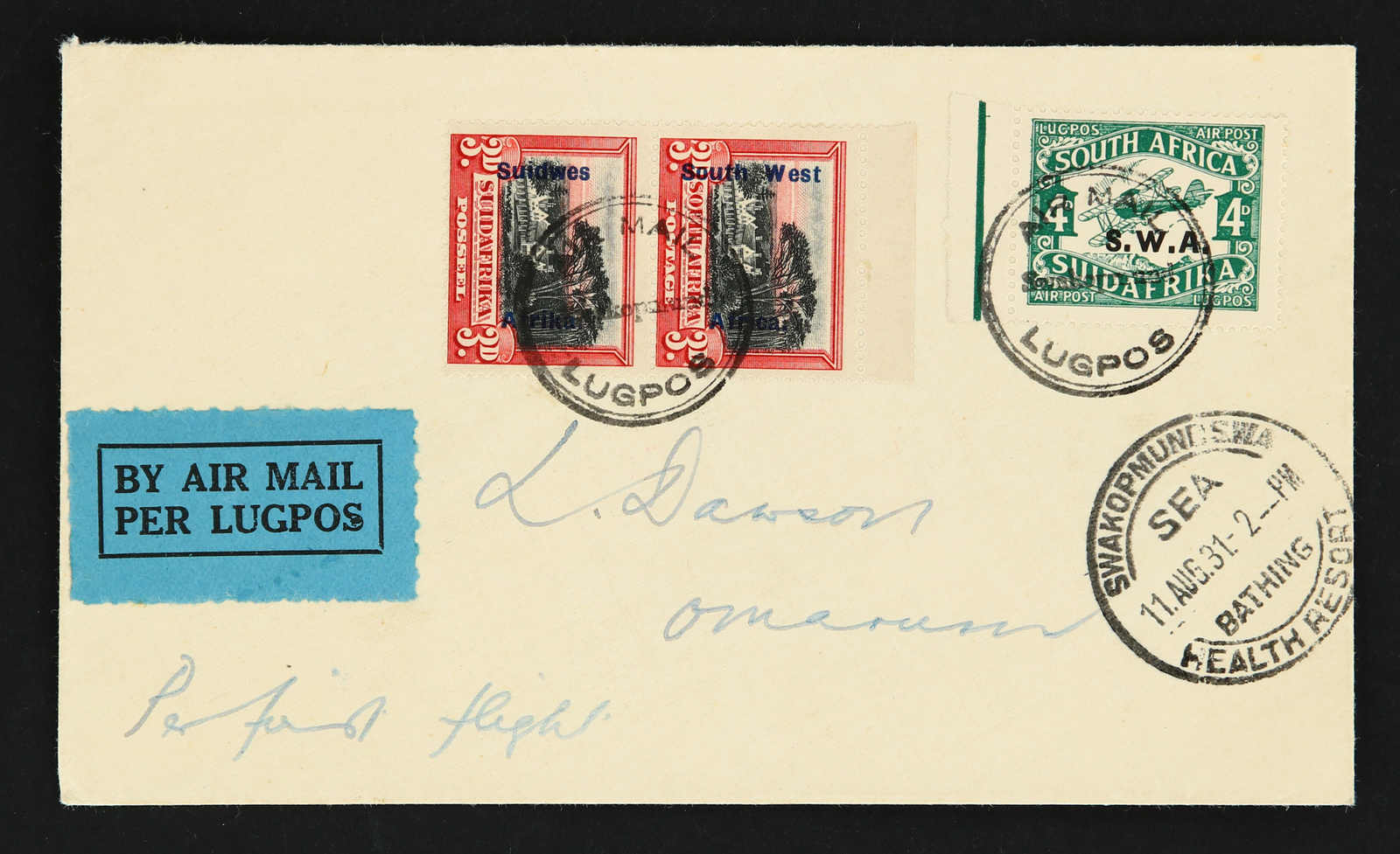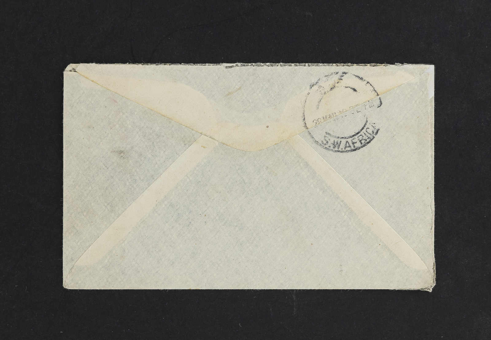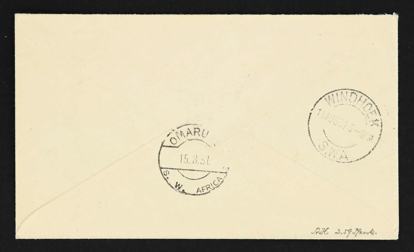 1931, Erstflugbrief Swakopmund-Omaruru, frankiert mit Südwestafrika Mi-Nr. 138 und 146-47, rückseitig aptierter Ankunftsstempel von Omaruru
