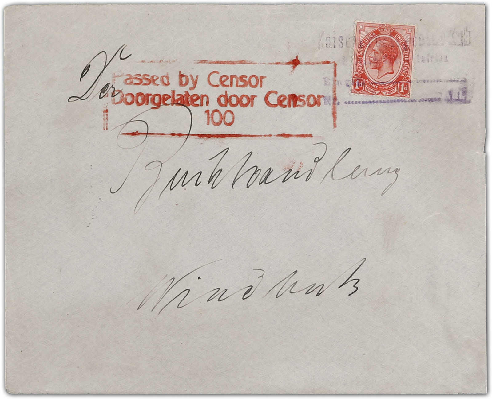 "Kaiserliche Postagentur Kub", violetter Vierzeiler als Entwertung auf zensiertem Inlandsbrief nach Windhuk, Frankatur 1 d. von Südafrika, leichte Beförderungsspuren, eine sehr seltene Entwertung (Image) (imagea)