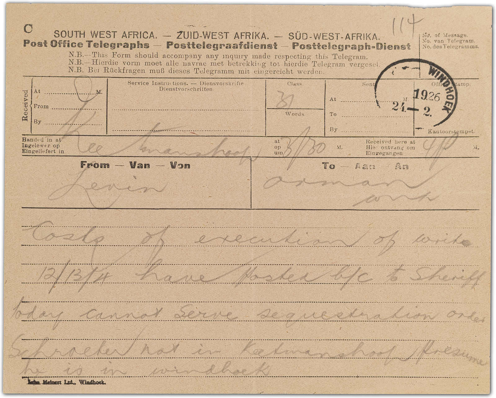 "WINDHOEK 24.-2. 1926", der aptierte Deutsche Bahnpoststempel nach nochmaliger Veränderung als Eingangsstempel auf mehrsprachigem Telegramm, einwandfrei