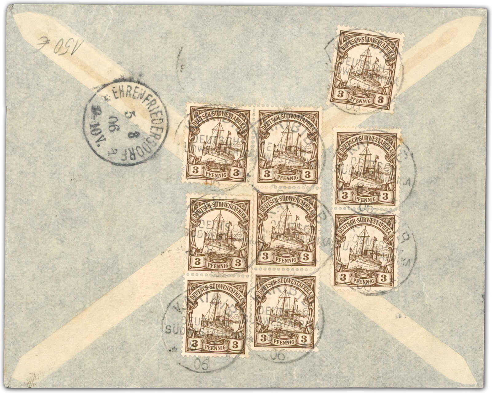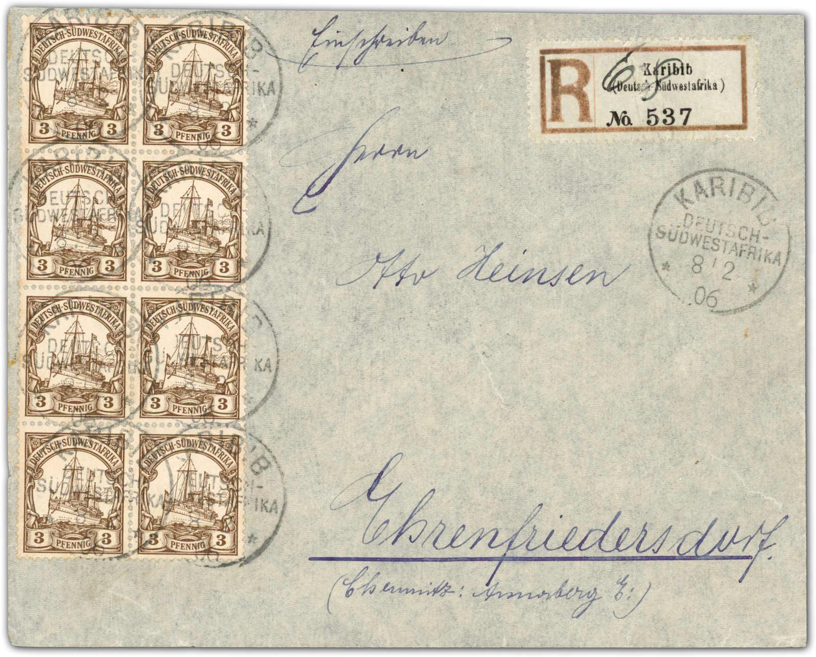 "KARIBIB DEUTSCH-SÜDWESTAFRIKA 8.2.06" 18 saubere Abschläge auf etwas überfrankiertem Einschreibbrief, vorder- und rückseitig frankiert mit 17 Werten der 3 Pfg. Kaiseryacht, adressiert nach Ehrenfriedersdorf, rückseitig mit Ankunftsstp.