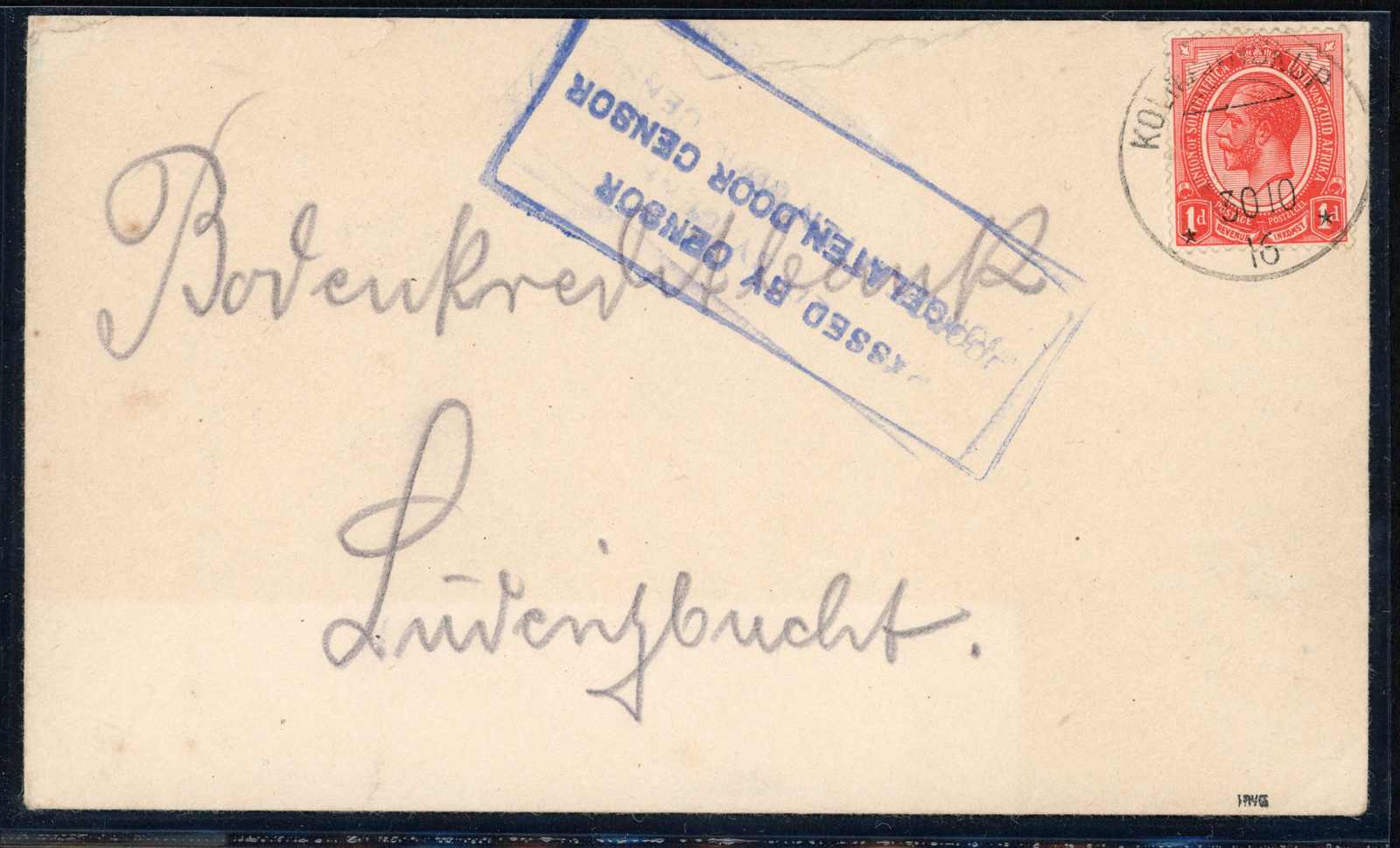 1916, 1 P. Südafrika rot (Bugspur) auf Brief nach Lüderitzbucht, apt. Stempel "KOLMANNSKOP 30 10 16", Zensurstempel, etwas unsauber geöffnet