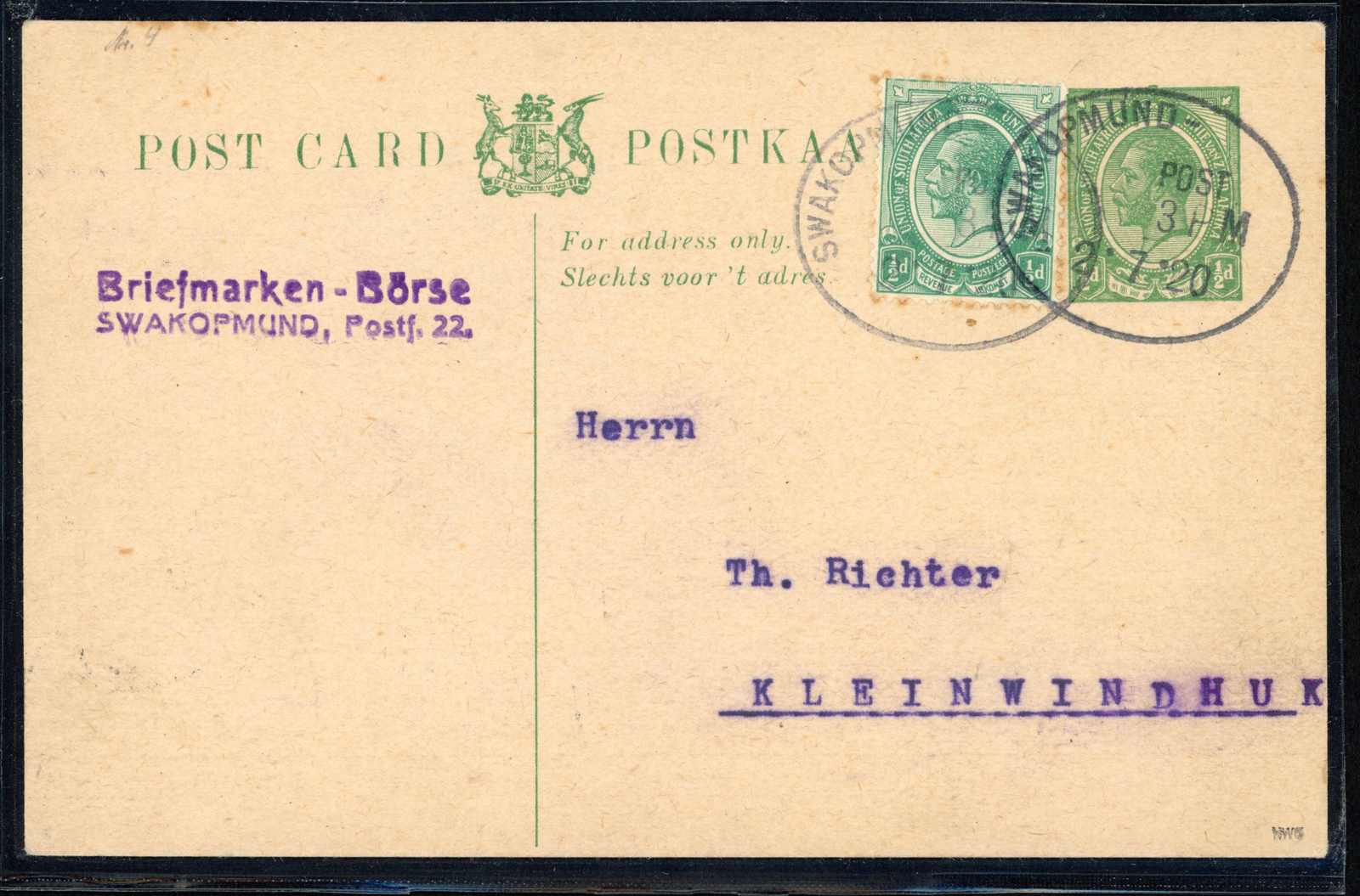 1920, ½ P. Südafrika Ganzsachenpostkarte mit wertstufengleicher Zusartfrankatur, apt. Bahnpoststempel "SWAKOPMUND- POST 2.7.20" nach Kleinwindhuk, rs. Ankunftsstempel vom 3.7.20, gute Bedarfsqualität (Image)