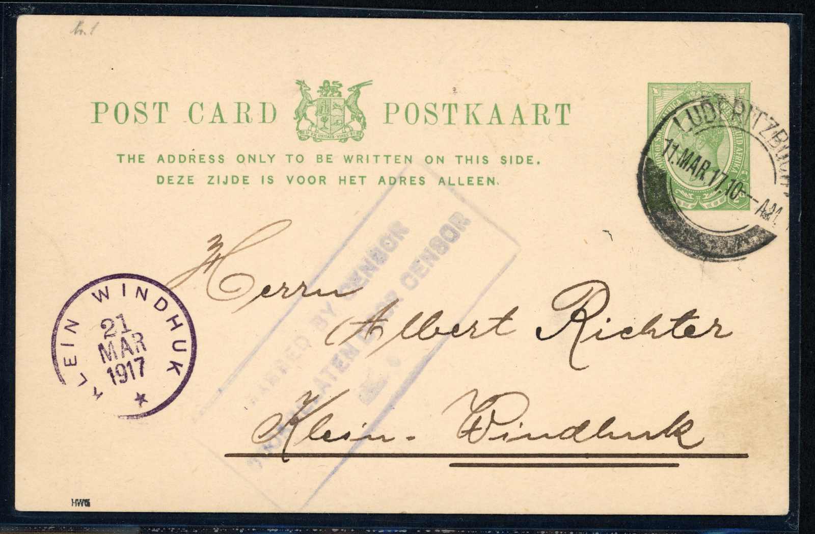 1917, ½ P. Südafrika Ganzsachenpostkarte ab "LÜDERITZBUCHT 11 MAR 17" nach Kleinwindhuk, vs. Ankunftsstempel "21 MAR 1917", Zensurstempel, rs. interessanter Lagebericht, gute Bedarfsqualität (Image)