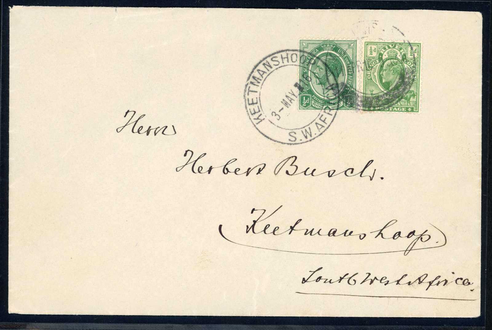 1916, ½ P. Südafrika und ½ P. Orange River Colony auf Ortsbrief ab "KEETMANSHOOP 3- MAY 16", gute Bedarfsqualität (Image)