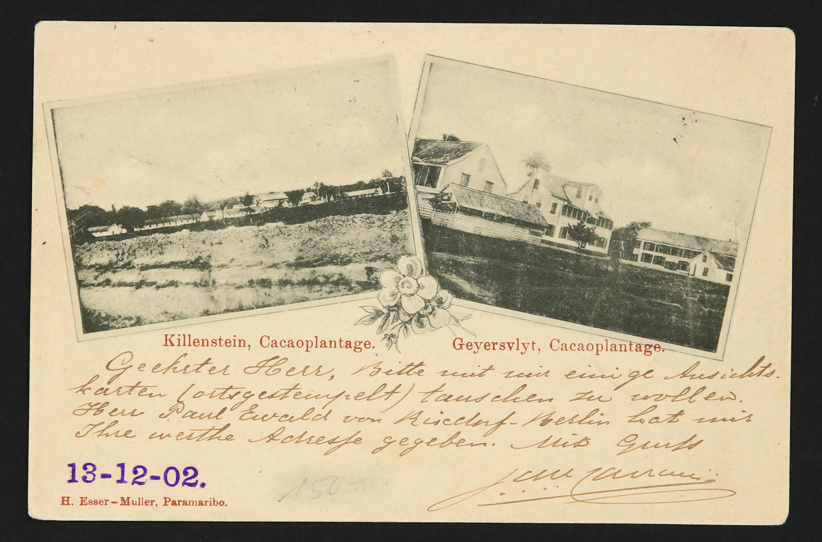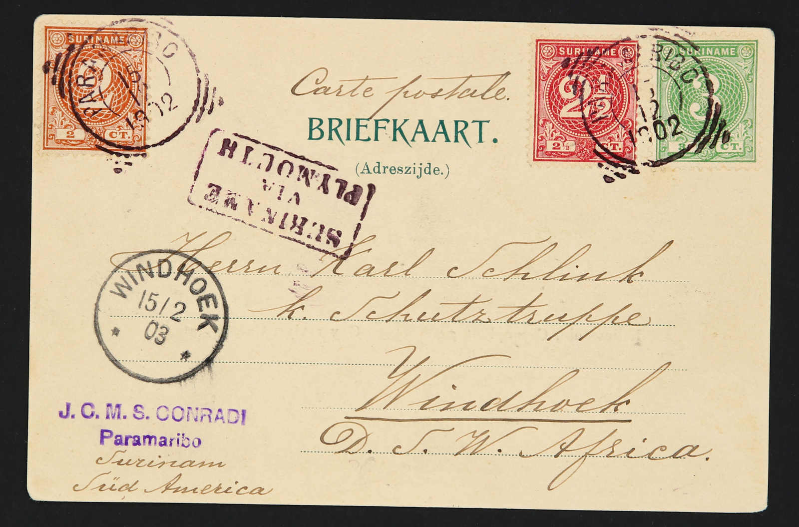 1902, eingehende Postkarte aus "PARAMARIBO 15 12 1902" (Niederländisch Suriname) mit Schiffspoststempel "SURINAME VIA PLYMOUTH" nach Windhuk (15/2 03), sehr seltene Eingangspost mit Bedarfstext, gute Qualität (Image) (imagea)