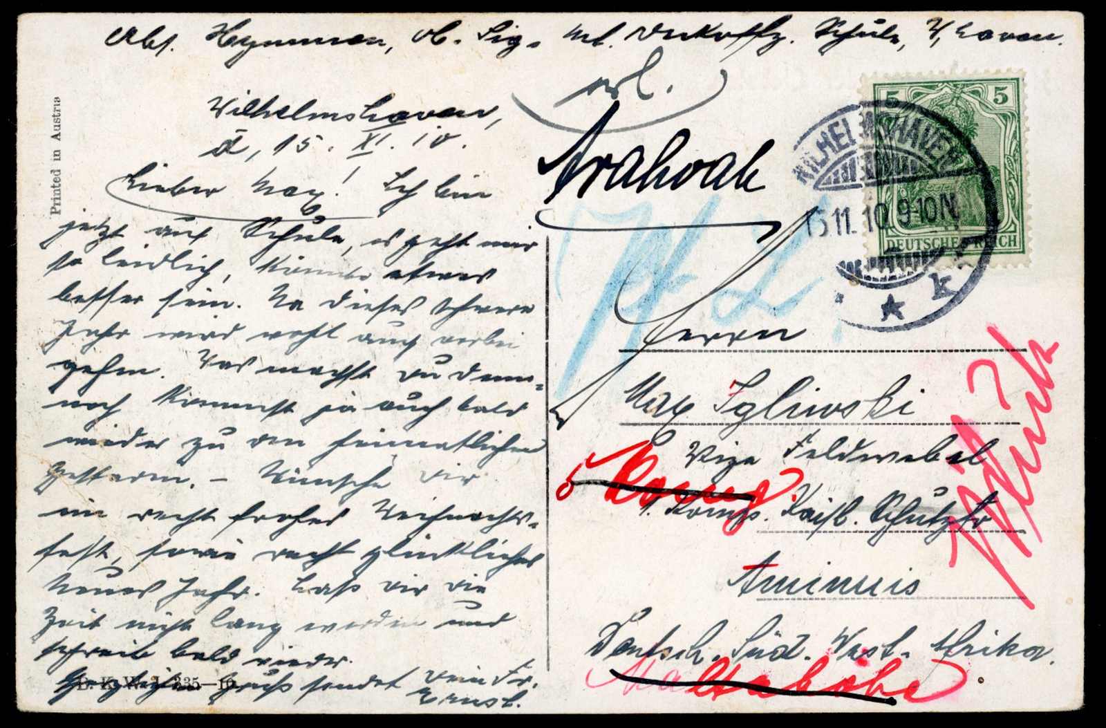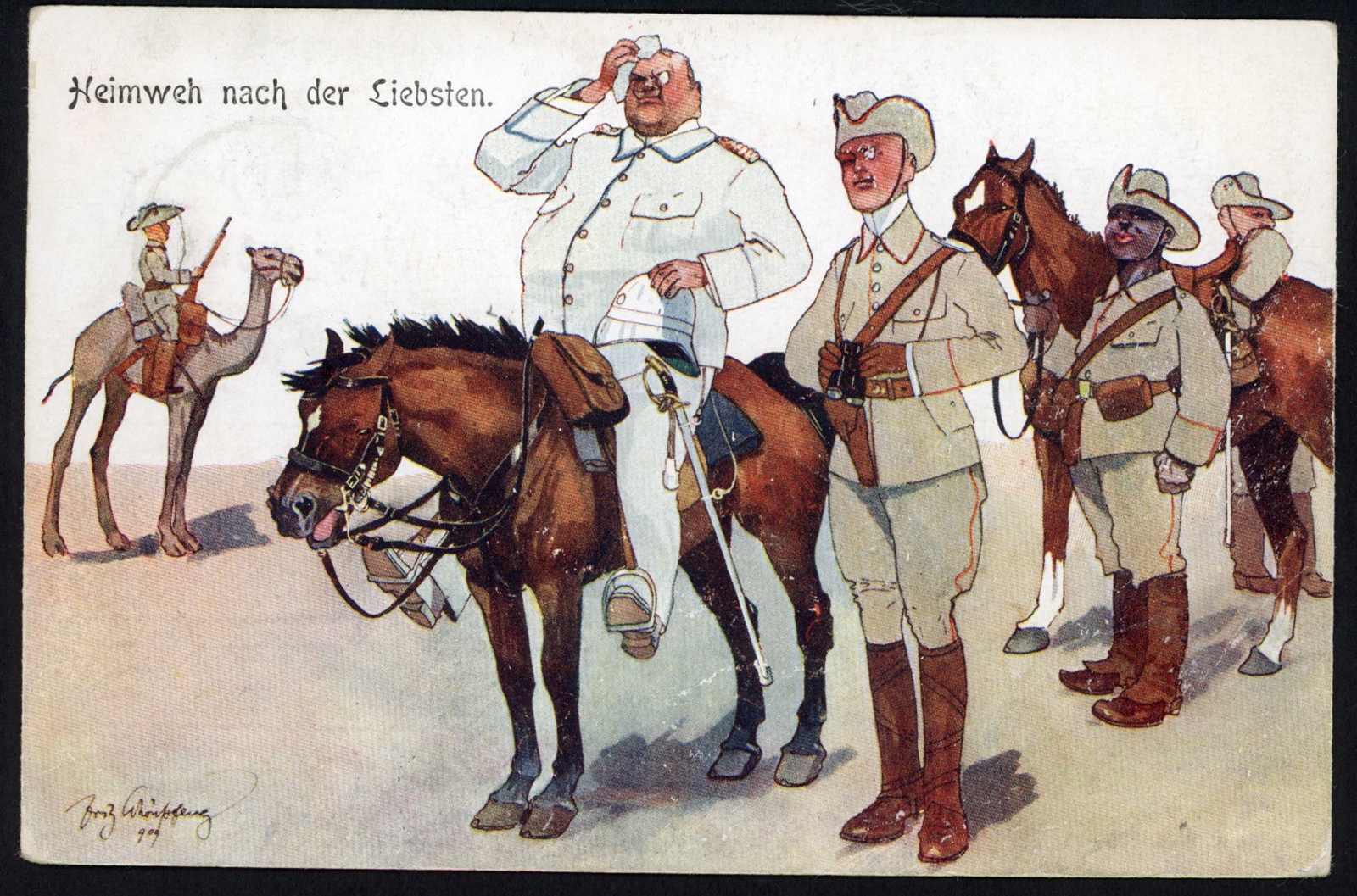 1910, eingehende Postkarte aus Wilhelmshaven, adressiert an einen Vizefeldwebel in Aminius DSWA, dort nicht zustellbar und mehrfach nachgesandt nach Maltahöhe, Windhuk und Arahoab, bildseitig hübsche Zeichnung "Heimweh nach der Liebsten",