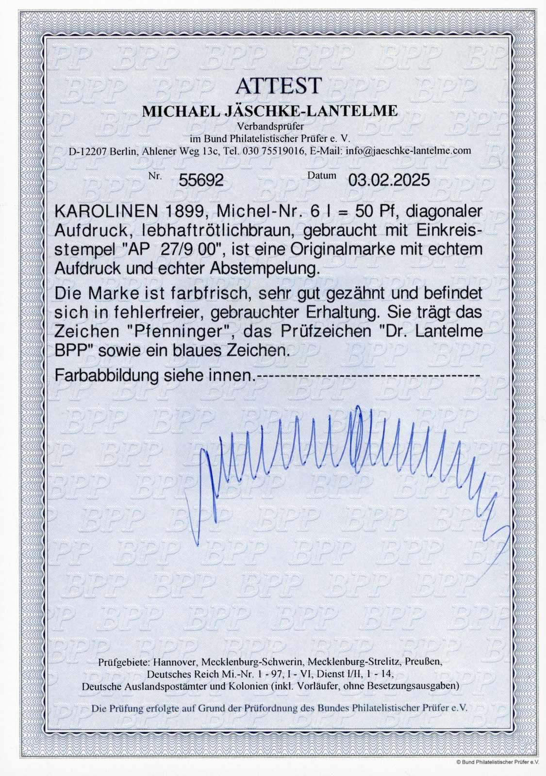 1899, 50 Pfg. Krone/Adler mit diagonalem Aufdruck, Ekr. "YAP 27/9 00", farbfrisch, sehr gut gezähnt und einwandfrei, Fotoattest Jäschke/Lantelme BPP 02/2025 (ME 1.800,-) (Image) (imagea)