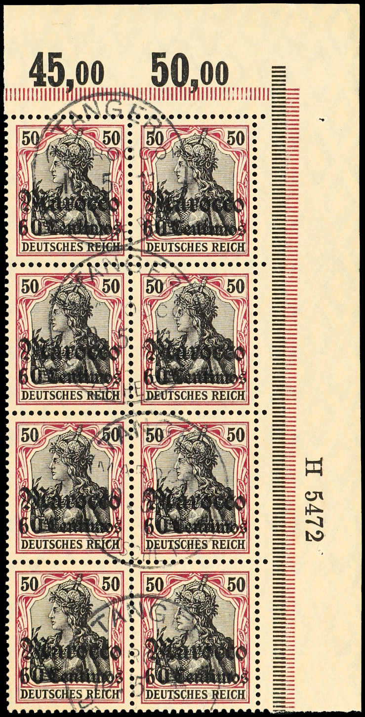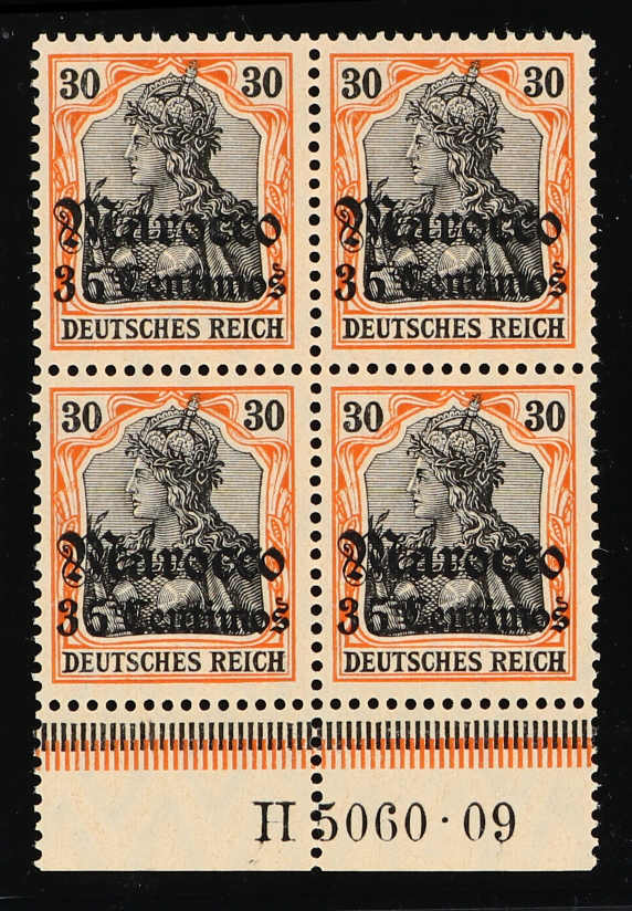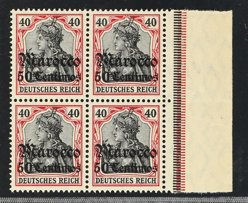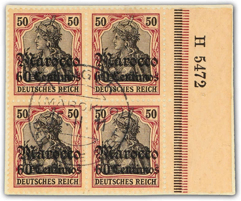 1905, 60 C. auf 50 Pfg. Germania dunkelbräunlichlila/braunschwarz a. mattbraunorange, gest. 4er-Block vom rechten Bogenrand, entwertet "TANGER MAROKKO DEUTSCHE POST 15.11.11", im Bogenrand mit der HAN H 5472, einwandfrei, sign. Bothe BPP