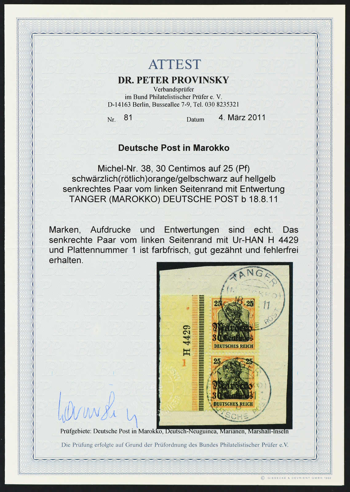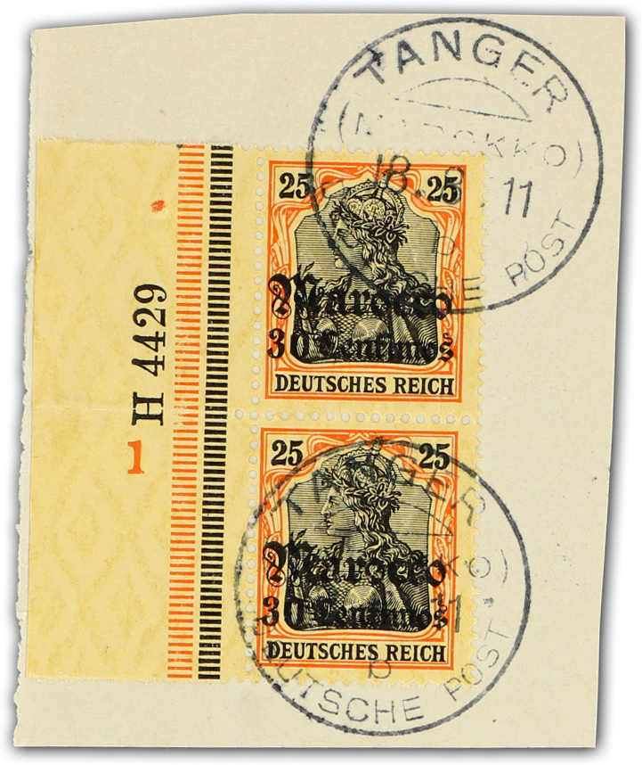 1906, 30 C. auf 25 Pfg. Aufdruckausgabe schwärzlich(rötlich)orange/gelbschwarz auf hellgelb, senkrechtes Paar vom linken Bogenrand mit Ur-HAN 4429 und Plattennummer "1", sauber gestempelt "TANGER (MAROKKO) DEUTSCHE POST b 18.8.11" ,