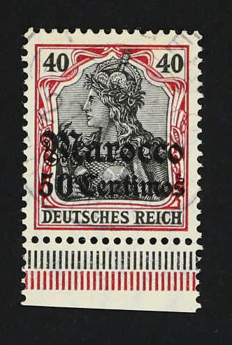 1906, 50 C. auf 40 Pfg. dunkelrötlichkarmin/braunschwarz, gest. Einzelwert vom Unterrand (beschnitten), zart entwertet "TANGER MAROKKO", farbfrisch und gut gezähnt, einwandfrei, doppelt sign. Bothe BPP (ME 360,-) (Image)