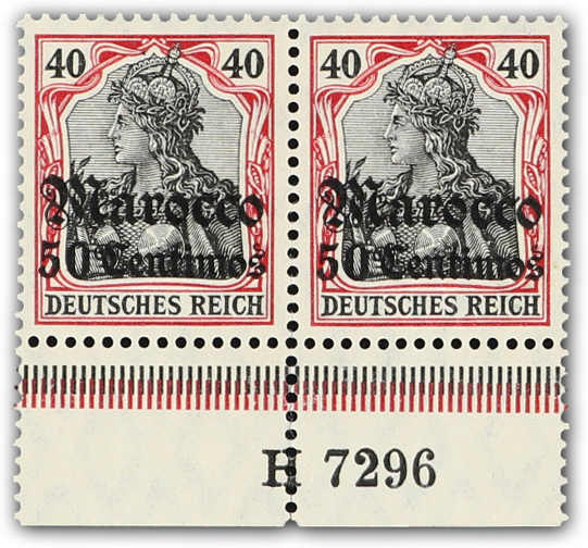 1908, 50 C. auf 40 Pfg. dunkelrötlichkarmin/braunschwarz, postfrisches waagerechtes Paar vom Unterrand mit unten anhängender HAN H 7296, farbfrisch und gut gezähnt, das Paar ist senkrecht von unten bis zur Markenmitte angetrennt, sonst