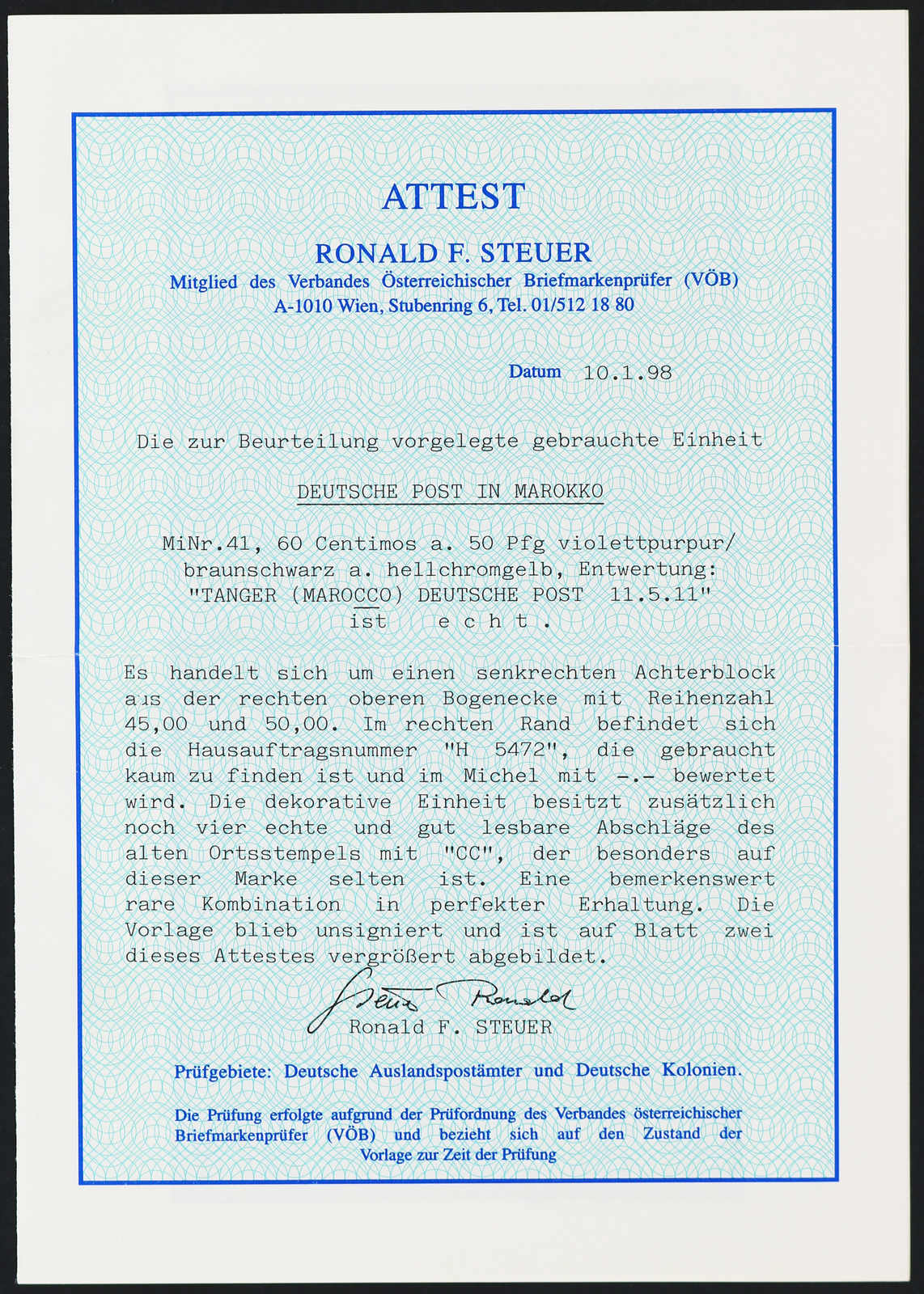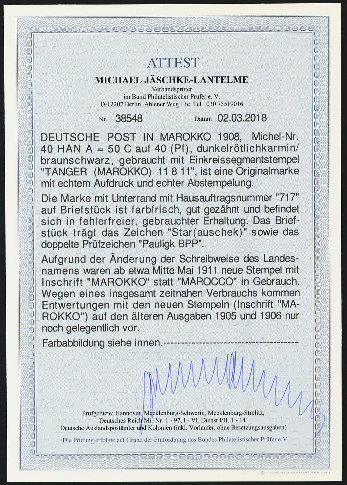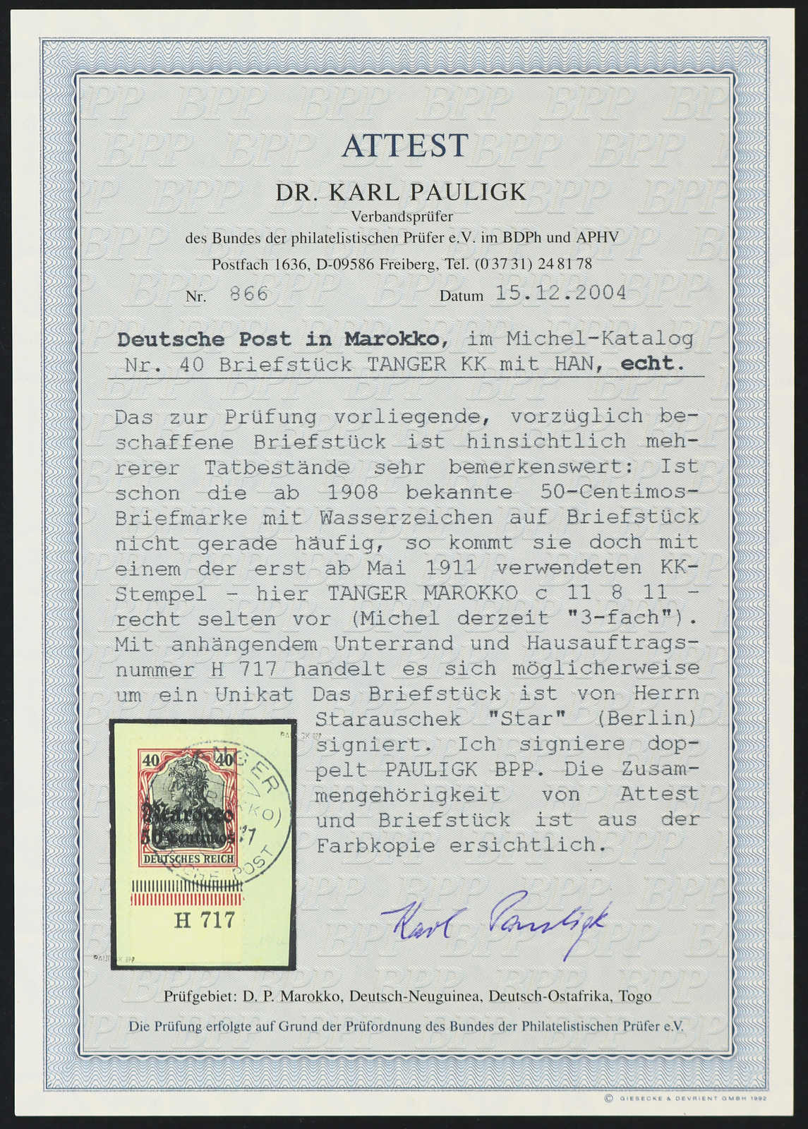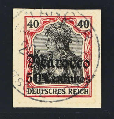 1908, 50 C. auf 40 Pfg. Aufdruckausgabe dunkelrötlichkarmin/braunschwarz, vom Unterrand mit Aufdruck-HAN H 717, klar gestempelt "TANGER (MAROKKO) 11 8 11" auf dekorativem Briefstück, einwandfrei, signiert u.a. Pauligk BPP, Fotoattest
