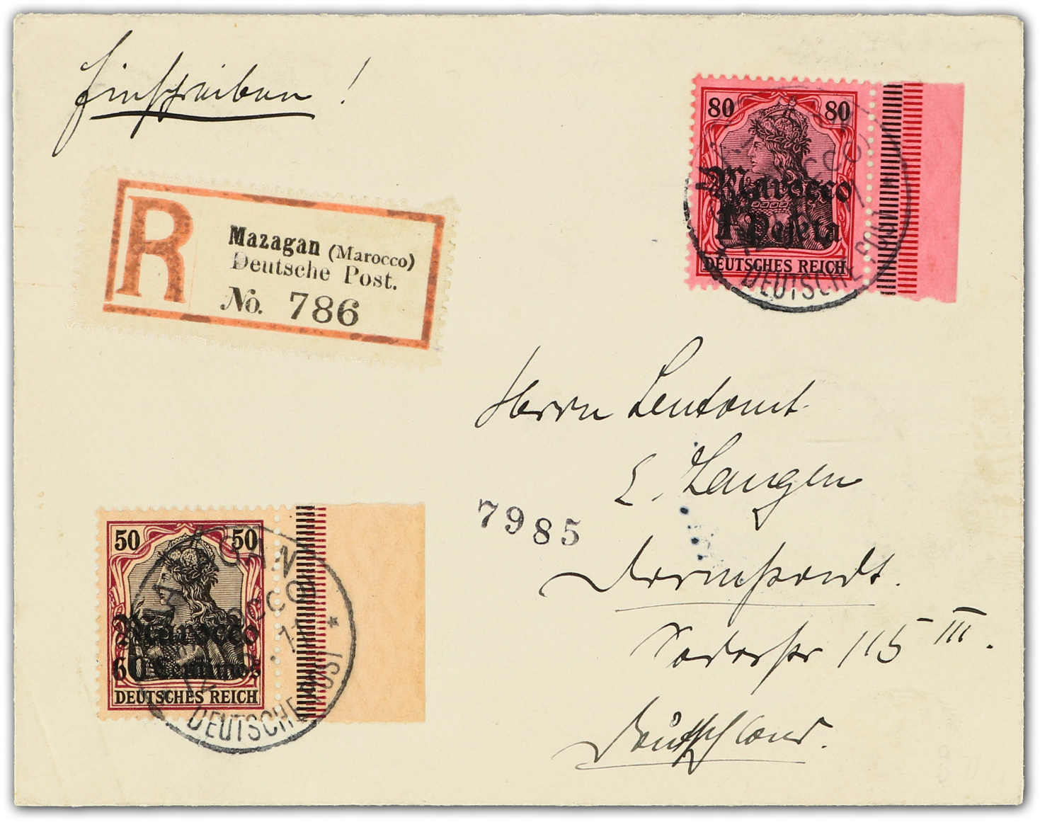 1911, 60 C. auf 50 Pfg. Germania und 1 P. auf 80 Pfg. Germania, auf Einschreibbrief, aufgegeben "MAZAGAN MAROCCO DEUTSCHE POST 12.5.11", adressiert nach Darmstadt, rückseitig Ankunftsstp. vom 25.5.11, seltener Beleg in sauberer Qualität